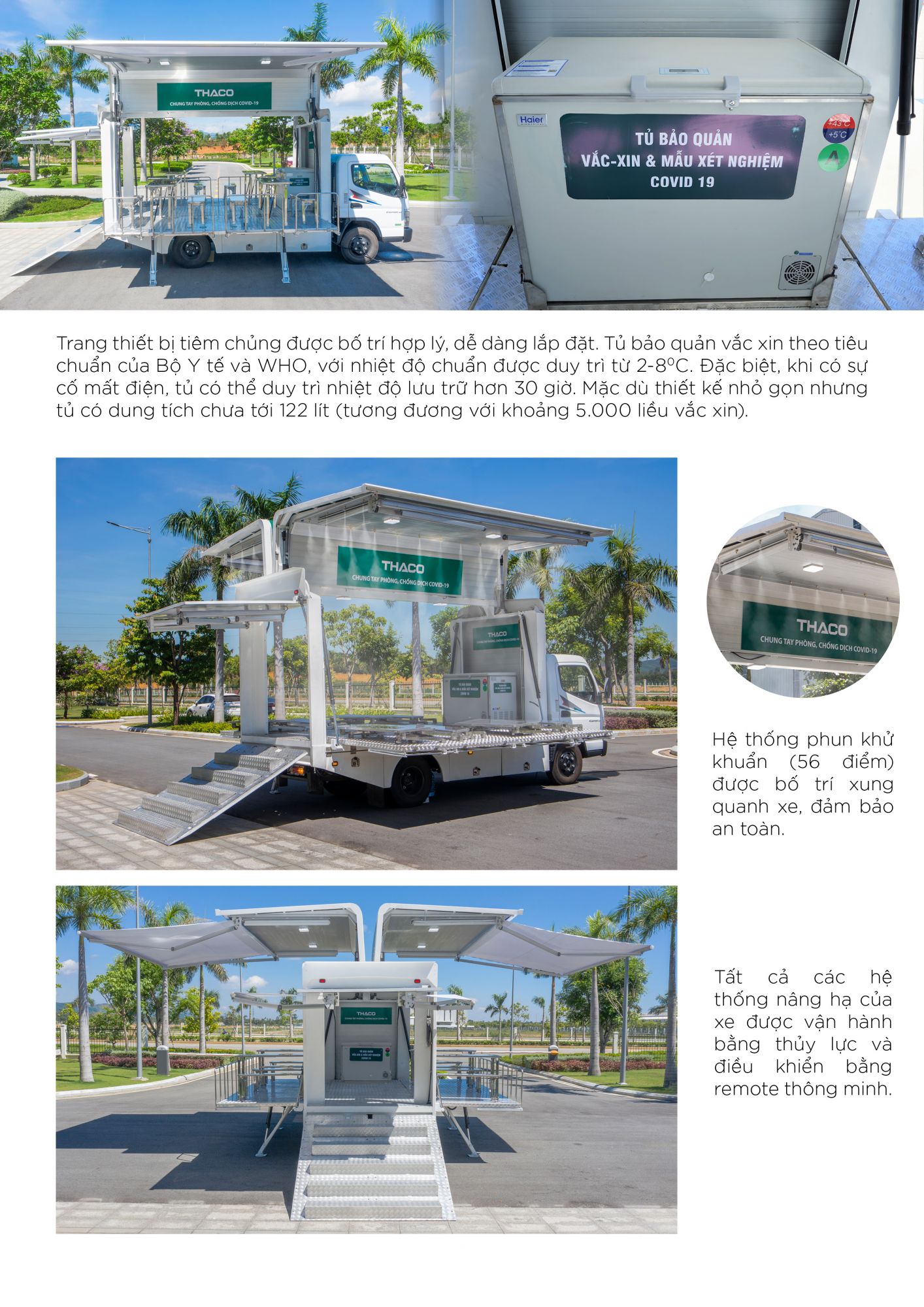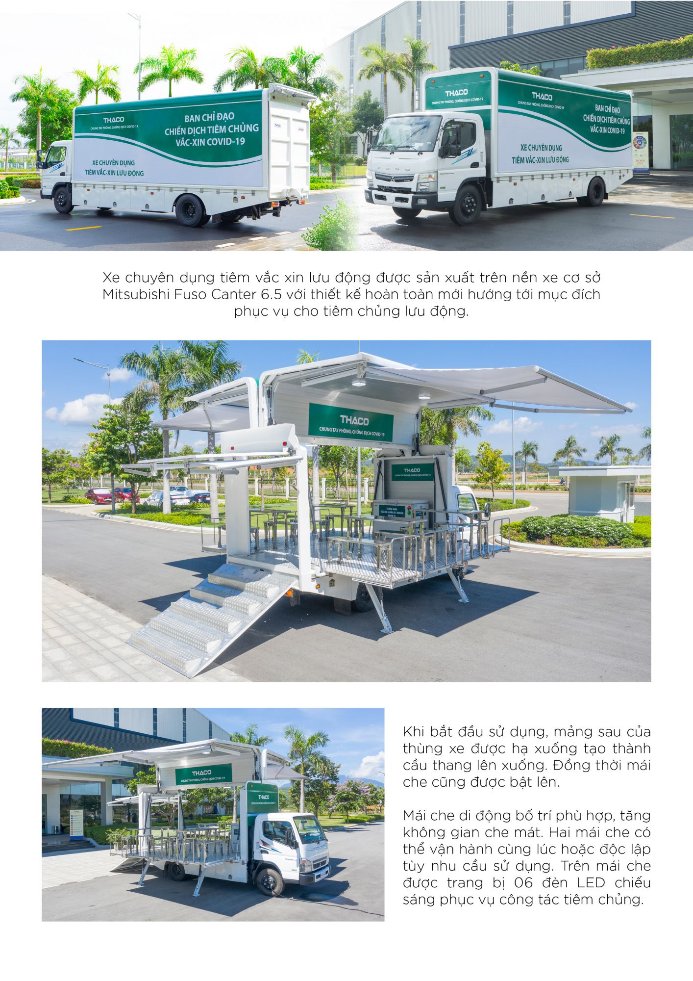 Phát triển từ mẫu xe cơ sở Mitsubishi Fuso Canter 6.5, xe tiêm chủng vaccine Covid-19 lưu động tại Việt Nam do Trường Hải (THACO) sản xuất có thể đáp ứng yêu cầu tiêm chủng an toàn, hiệu quả tại các vùng điều kiện đi lại còn khó khăn, đồng thời sử dụng cho công tác lấy mẫu xét nghiệm...