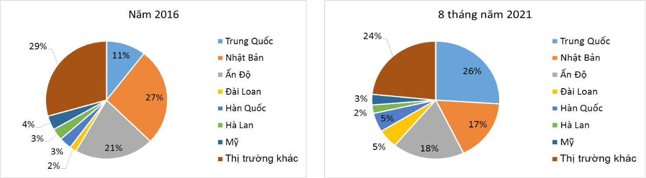 Trong giai đoạn từ năm 2016 đến 8 tháng đầu năm 2021, cơ cấu thị trường xuất khẩu hóa chất của Việt Nam đã có sự chuyển dịch khi thị phần xuất khẩu sang Trung Quốc tăng lên và thị của Ấn Độ và Nhật Bản giảm.