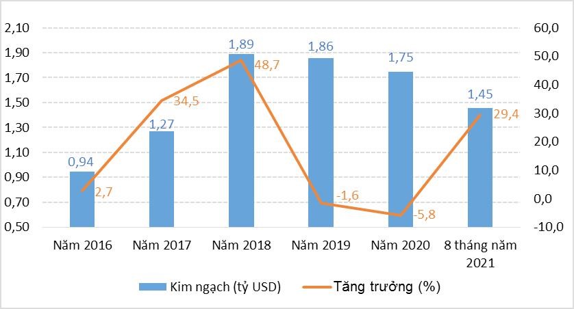 Kim ngạch và tăng trưởng xuất khẩu của mặt Trang Chủ Game 33win com Mới Nhất chất từ năm 2016 đến 8 tháng năm 2021