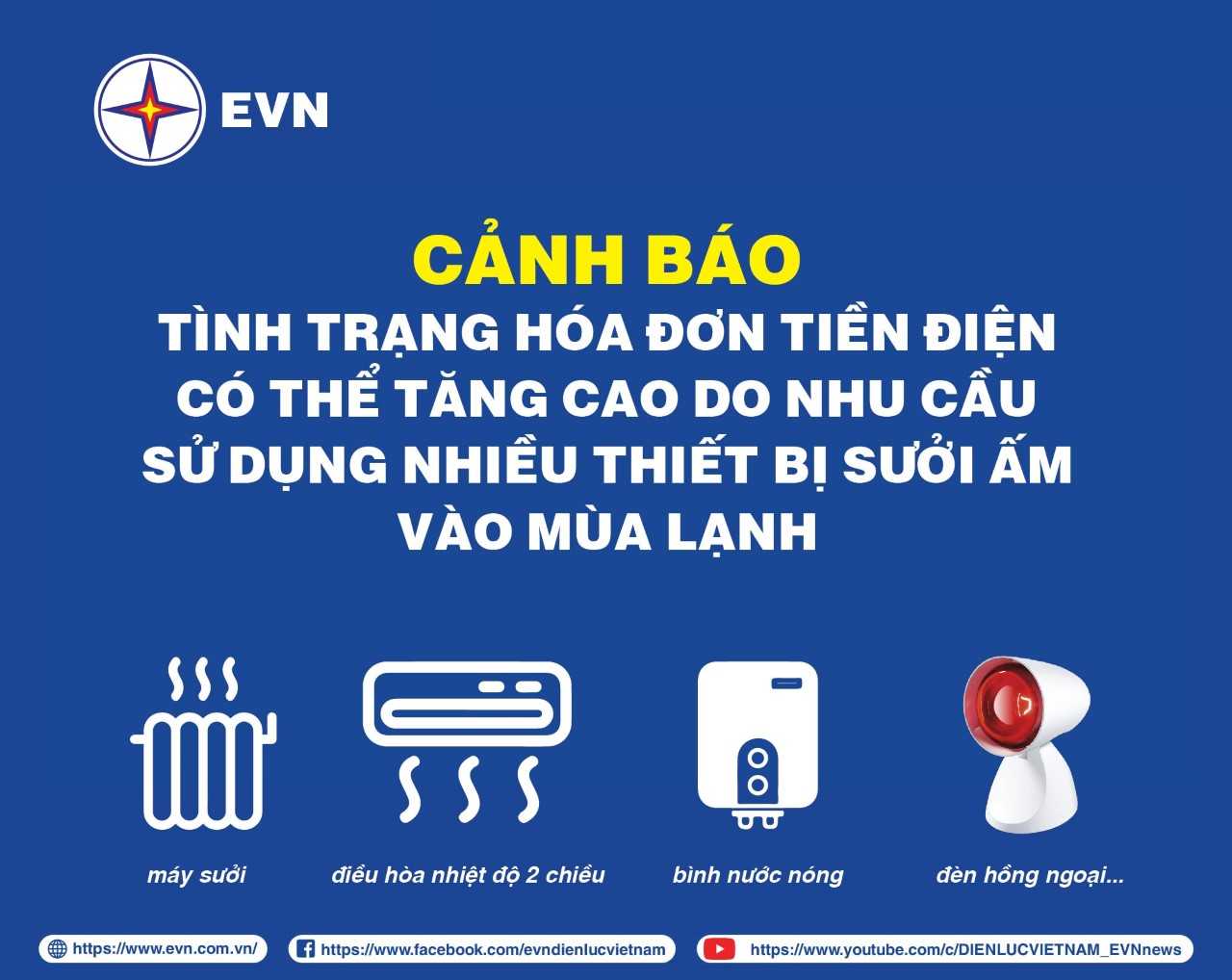Cảnh báo tình trạng hóa đơn tiền điện có thể tăng cao do nhu cầu sử dụng nhiều thiết bị sưởi ấm vào mùa lạnh EVN đề nghị và khuyến cáo các khách hàng cần thường xuyên kiểm tra dây sau công tơ của gia đình để kịp thời thay thế, sửa chữa khi dây điện sau công tơ bị đứt, hỏng phần vỏ cách điện, gây chạm chập dễ dẫn tới mất an toàn và cũng làm hóa đơn tiền điện tăng cao.