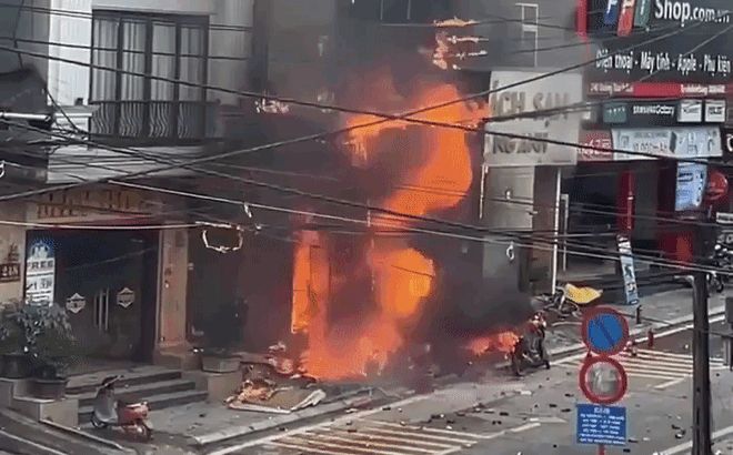 Nâng gầu lên cứu 2 em nhỏ bị mắc kẹt ở tầng 2 Đám cháy bốc lên dữ dội Ngay sau khi cứu được 2 cháu bé, nhiều bình gas trong cửa hàng đã phát nổ |