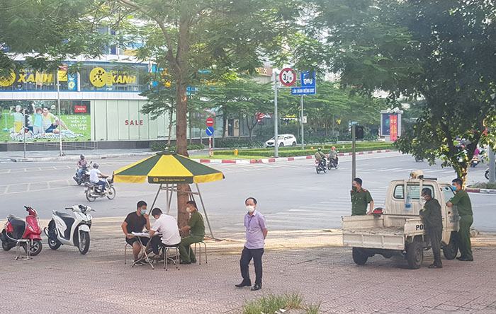 Lực lượng chức năng kiểm tra, xử lý người vi phạm phòng dịch tại ngã tư Hoàng Đạo Thuý - Lê Văn Lương (quận Thanh Xuân)