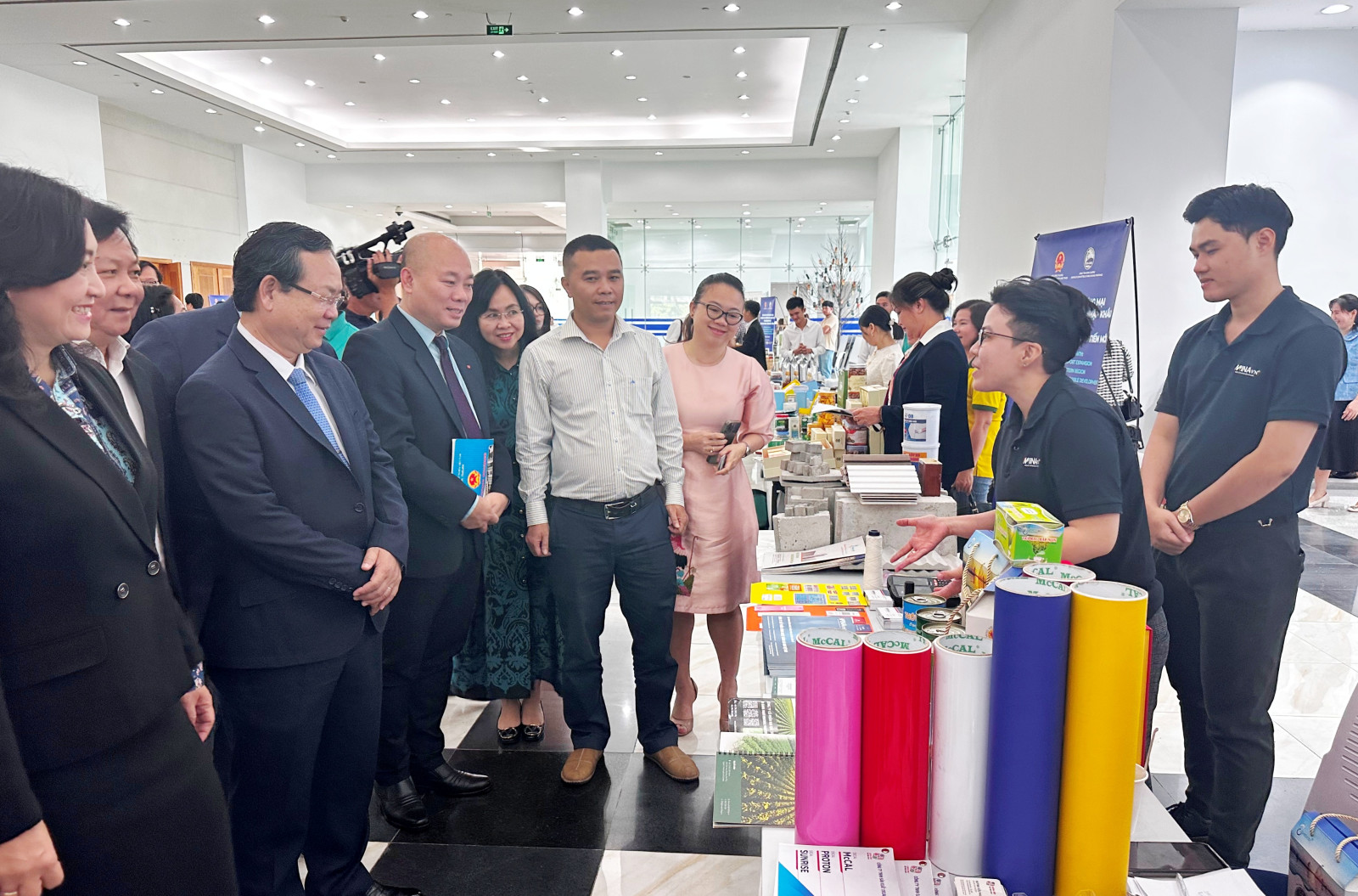 Các đại biểu tham quan khu trưng bày sản phẩm đặc trưng của các địa phương vùng Đông Nam Bộ