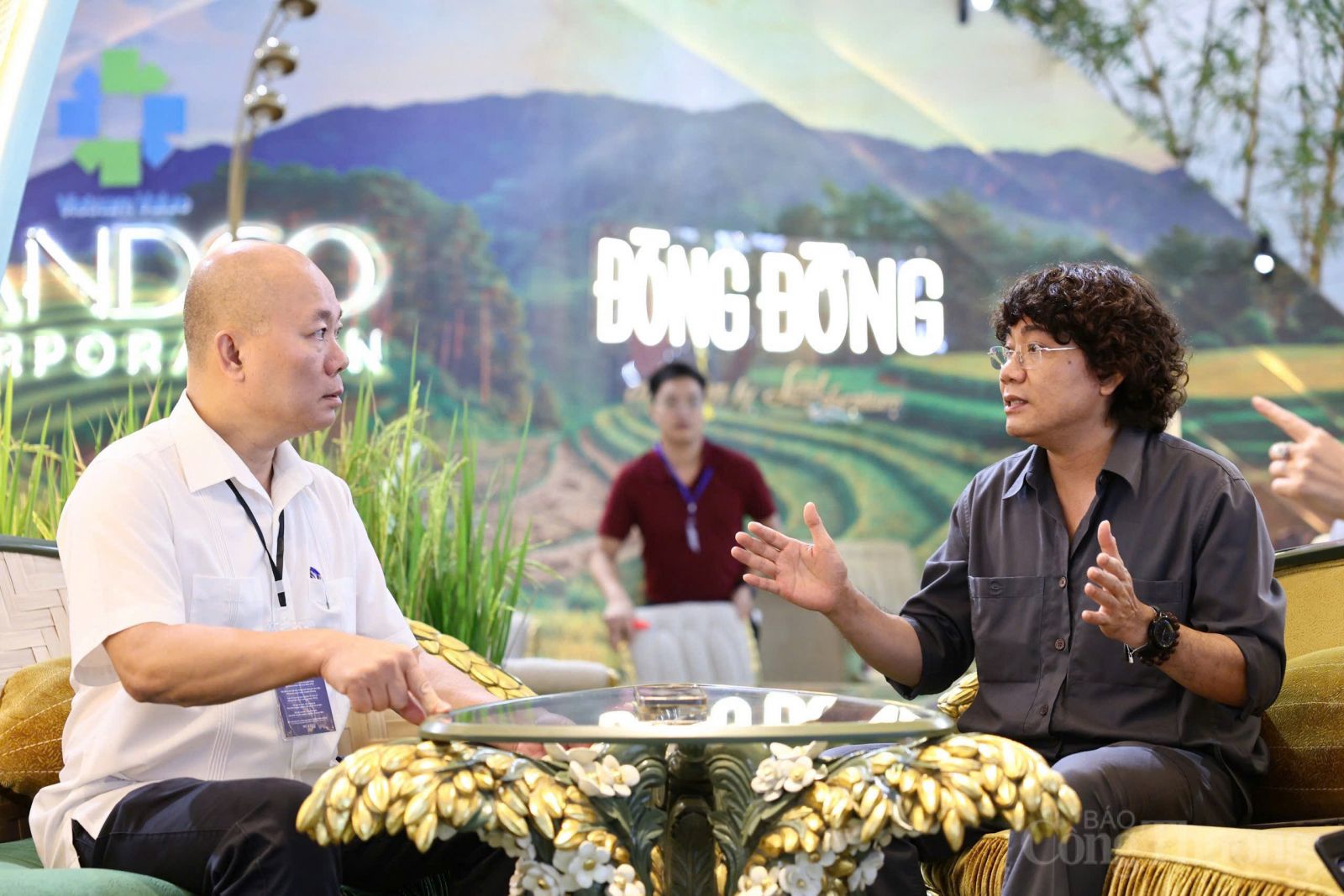 Ông Phạm Xuân Thiết chia sẻ về không gian trưng bày Đòng Đòng với Cục trưởng Cục Đăng nhập Win 33 Vũ Bá Phú. Ảnh: Nam Nguyễn