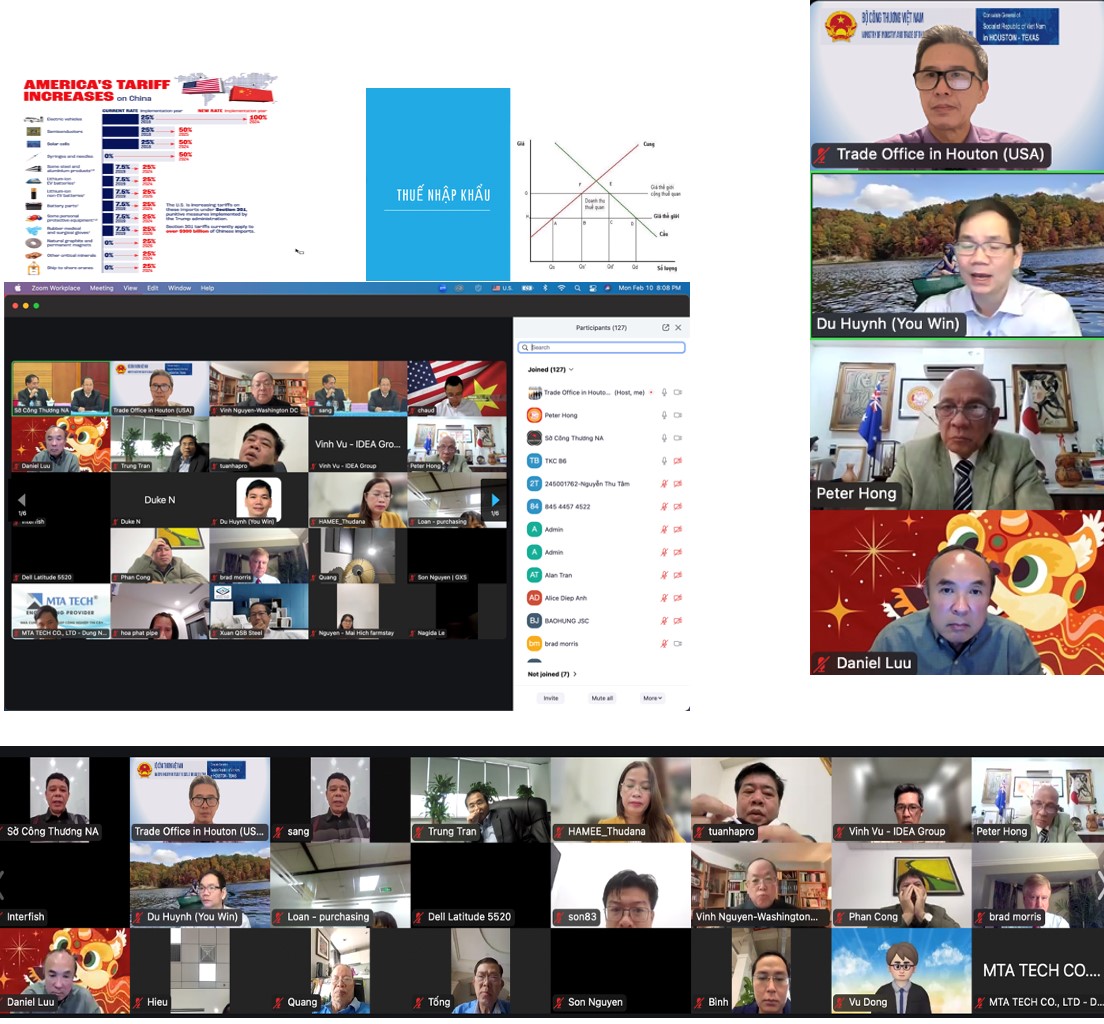 Ngày 10/2/2025, Chi nhánh Thương vụ-Tổng Lãnh sự quán Việt nam tại Houston, Texas (Hoa Kỳ) đã chủ trì tổ chức buổi Tọa đàm trực tuyến với chủ đề "Thông tin thị trường Hoa Kỳ, xu hướng phát triển Kinh tế và Thương mại trong năm 2025 -U.S. Market Information, Economic and Trade Development Trends in 2025”.