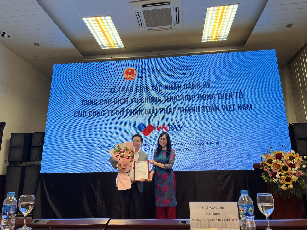 Cục trưởng Lê Hoàng Oanh trao giấy xác nhận cho Công ty Cổ phần Giải pháp Thanh toán Việt Nam VNPay