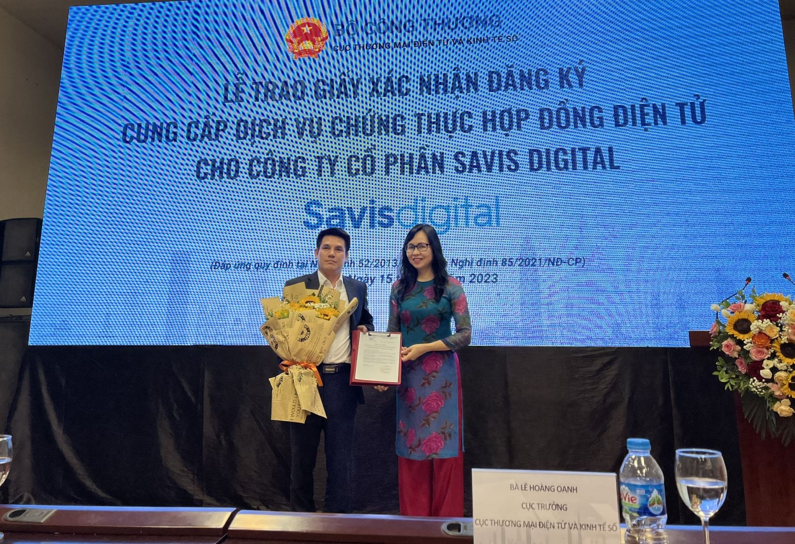 Cục trưởng Lê Hoàng Oanh trao giấy xác nhận cho Công ty Cổ phần SAVIS Digital