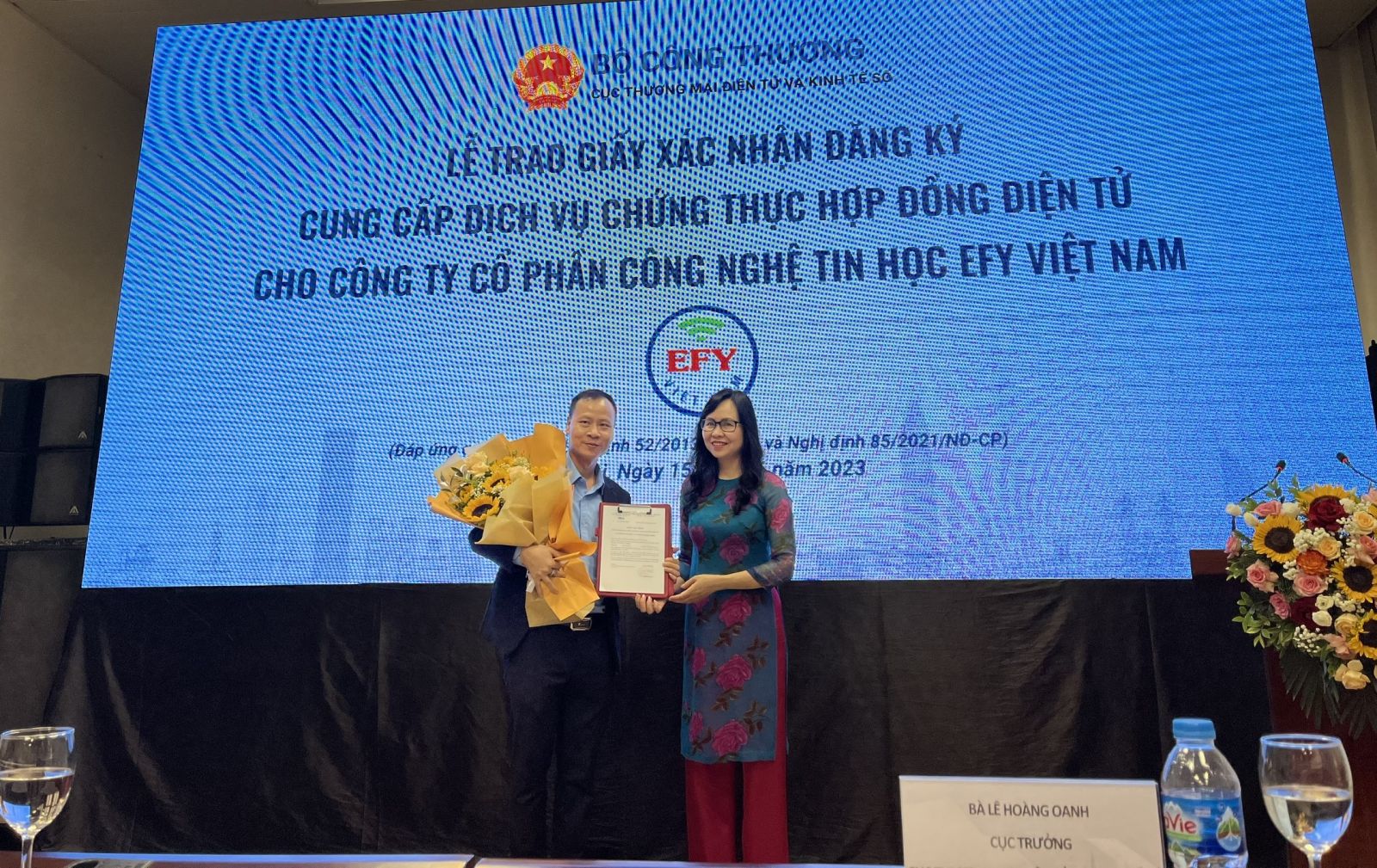 Cục trưởng Lê Hoàng Oanh trao giấy xác nhận cho Công ty cổ phần công nghệ tin học EFY Việt Nam