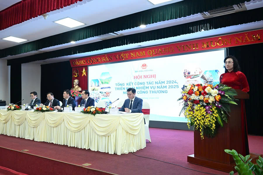 Thứ trưởng Phan Thị Thắng báo cáo tóm tắt về tình hình thực hiện nhiệm vụ năm 2024 và phương hướng nhiệm vụ năm 2025 của ngành Công Thương