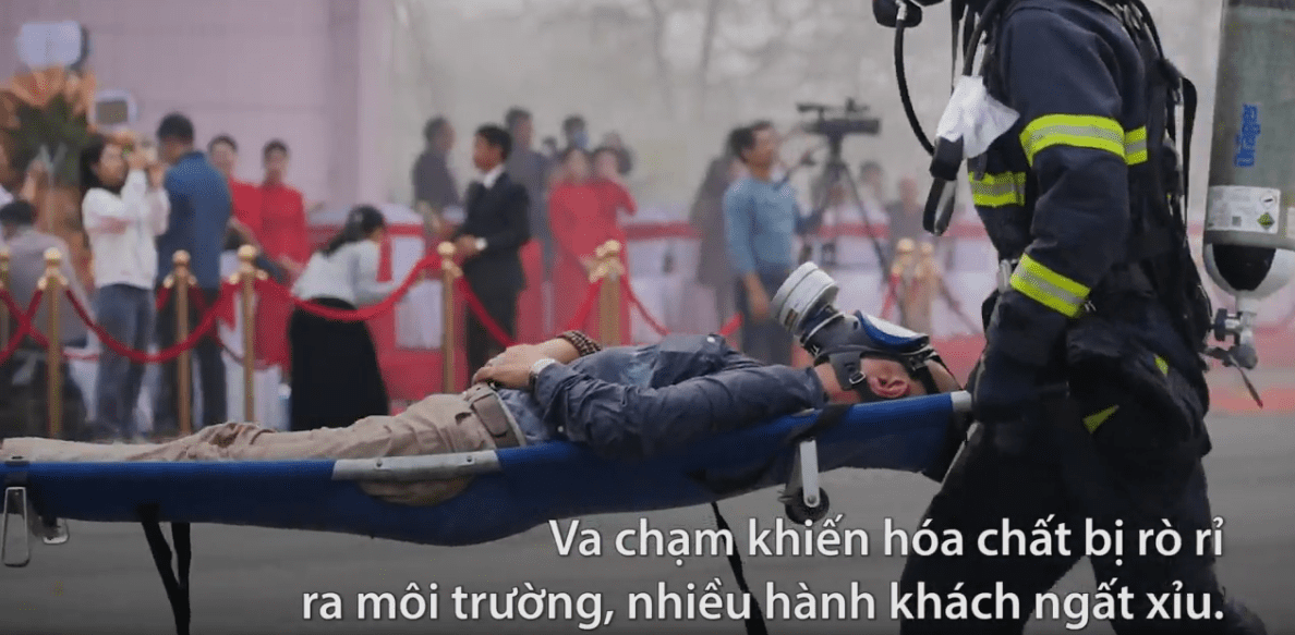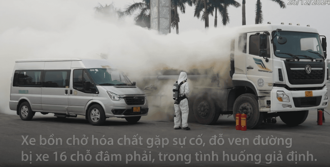 Tình huống giả định sự cố xảy ra trên đường giao thông, một xe bồn chứa hóa chất Methanol dung tích 20m3 gặp phải sự cố dẫn đến lái xe phải dừng xe để xử lý. Cùng lúc đó, một xe khách 16 chỗ do thiếu quan sát nên đã va chạm với xe bồn. Van khóa đường ống dẫn tại xe bồn bị vỡ do va chạm dẫn tới hóa chất liên tục thoát ra ngoài môi trường tạo thành khu vực nhiễm độc.