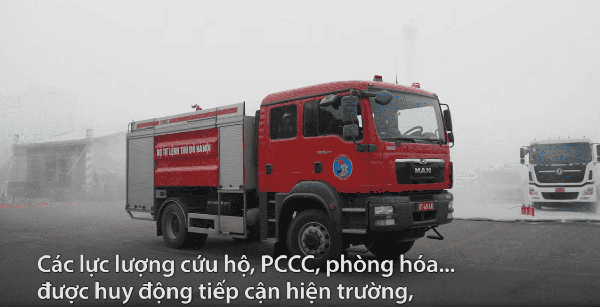 Bên cạnh các lực lượng quân đội, Công an TP Hà Nội cũng huy động cán bộ, chiến sỹ phóng cháy chữa cháy với đầy đủ các khí tài, phương tiện bảo hộ, xe ô tô chuyên dụng đảm bảo phân luồng giao thông, bảo vệ hiện trường và phương tiện nghiệp vụ khác.