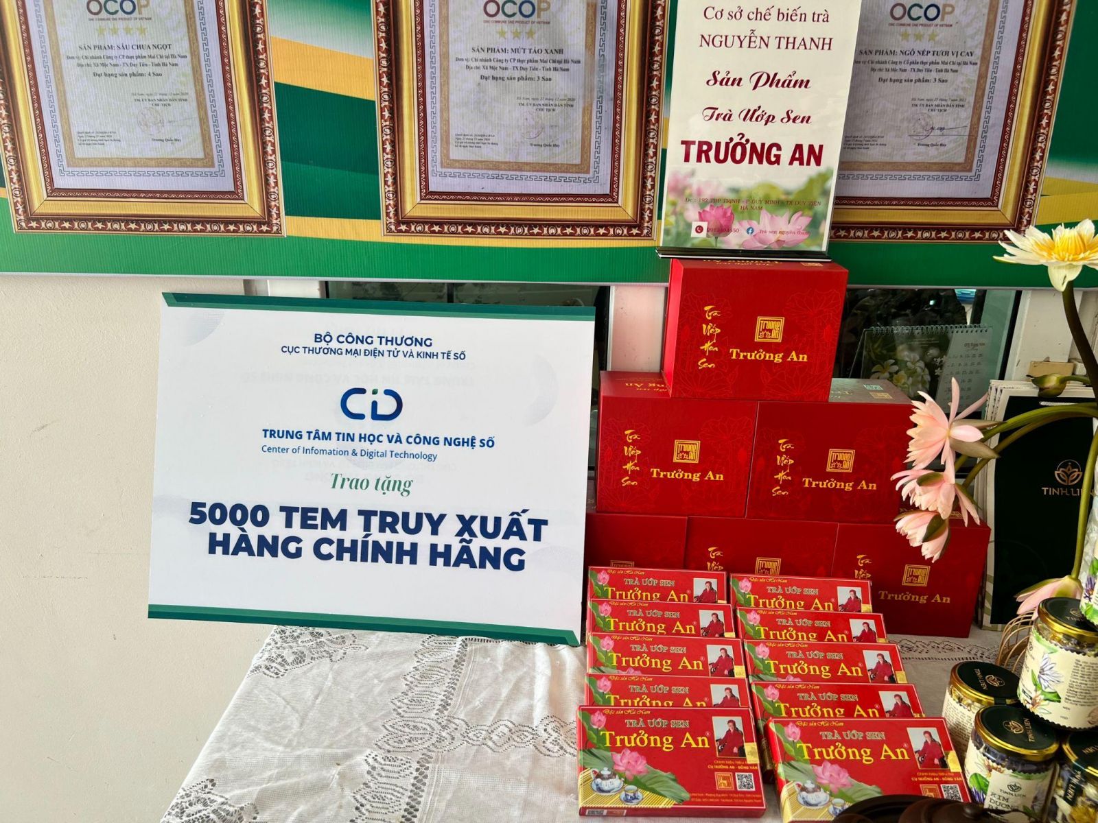 Hội viên Nguyễn Thanh - chủ thể của sản phẩm Trà ướp sen Trưởng An - phường Duy Minh tiếp nhận phần quà là 5000 tem truy xuất hàng chính hãng do Trung tâm Tin học và Công nghệ số trao tặng