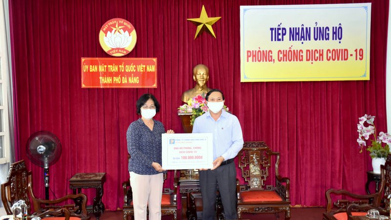 Phó Giám đốc Công ty Trần Văn Nhân trao tiền ủng hộ phòng chống dịch COVID-19 cho đại diện UBMTTQ Việt Nam thành phố Đà Nẵng