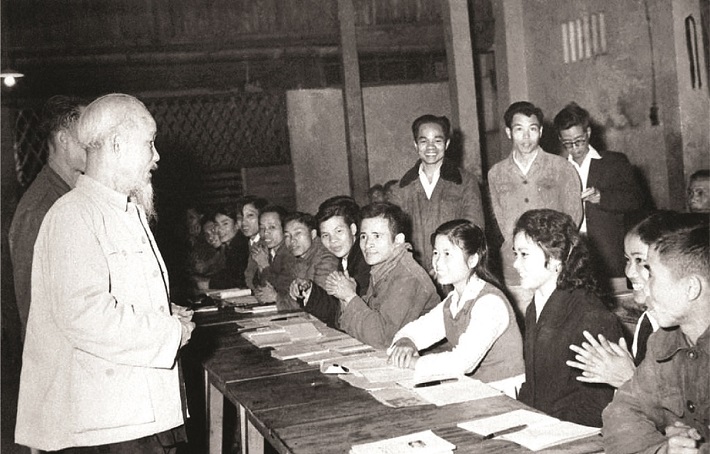 Bác Hồ gặp gỡ giới Công Thương Hà Nội tại Bắc Bộ phủ năm 1945. (Ảnh: Tư liệu)