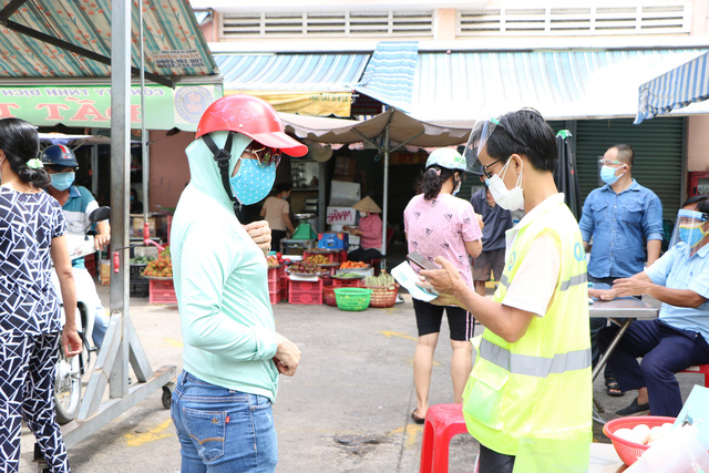 Tổ chức kiểm soát tốt người mua bán tại chợ: người làm việc tại chợ phải khai báo y tế trước khi vào chợ (bằng mã QR code hoặc thẻ ra vào chợ…); tổ chức đo thân nhiệt tại khu vực cửa vào chợ; sát khuẩn tay; đeo khẩu trang và giữ khoảng cách theo quy định; bố trí biển báo quy định phòng, chống dịch đối với khách hàng, bố trí đầy đủ nước sát khuẩn tay; bố trí khu vực xếp hàng vào chợ có kẻ vạch giãn cách giữa các khách hàng theo quy định.