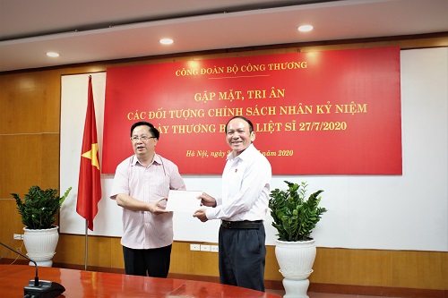 Ông Quách Văn Ngọc – Phó Chủ tịch Công đoàn Công Thương Việt Nam tặng quà của Công đoàn Ngành cho Ban Liên lạc thương binh cơ quan Bộ
