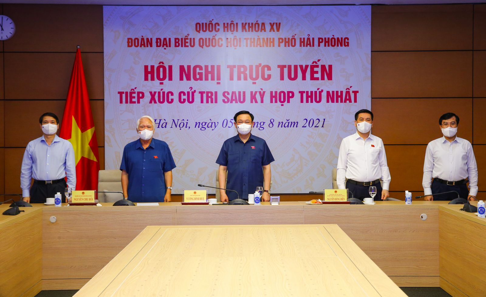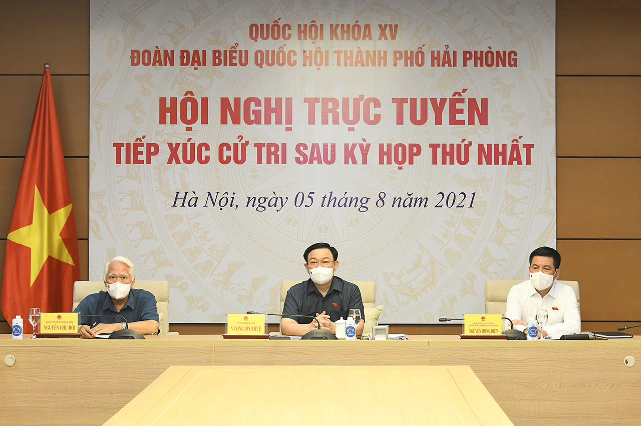 Chủ tịch Quốc hội Vương Đình Huệ đánh giá vừa qua thành phố Hải Phòng đã tổ chức thành công bầu cử đại biểu Quốc hội khóa XV và đại biểu Hội đồng nhân dân các cấp nhiệm kỳ 2021-2026. Nhân dịp này, thay mặt Đoàn đại biểu Quốc hội Tp.Hải Phòng, Chủ tịch Quốc hội gửi lời cảm ơn cử tri và Nhân dân thành phố đã tin tưởng, tín nhiệm cao bầu vào Quốc hội khóa XV; đồng thời hứa với cử tri và Nhân dân thành phố các đại biểu Quốc hội sẽ nghiêm túc thực hiện tốt chương trình hành động, cố gắng thực hiện bằng được các cam kết trước cử tri và Nhân dân; mong muốn cử tri và bà con nhân dân tăng cường kiểm tra, giám sát, động viên, khích lệ, nhắc nhở các đại biểu trong nhiệm kỳ 5 năm này.