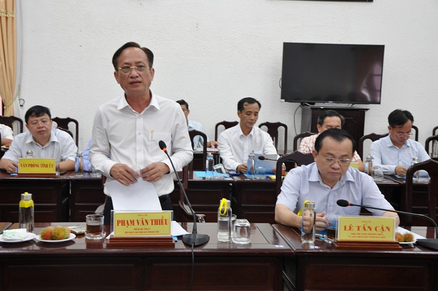 Chủ tịch UBND tỉnh Bạc Liêu Phạm Văn Thiều báo cáo những kết quả của hoạt động Công Thương tại Bạc Liêu trong 8 tháng đầu năm với Đoàn công tác
