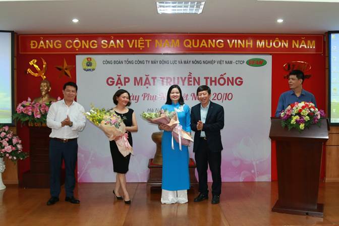 Đồng chí Hồ Mạnh Tuấn - Phó Bí thư Đảng ủy và đồng chí Mai Mạnh Dũng - Chủ tịch Công đoàn tặng hoa chúc mừng đại diện Nữ giới tham dự buổi gặp mặt