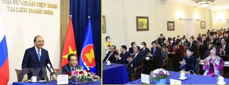 Phát biểu tại buổi gặp mặt, Chủ tịch nước Nguyễn Xuân Phúc cho biết, vừa có cuộc hội đàm rất thành công với Tổng thống Nga Vladimir Putin. Hai nhà lãnh đạo cùng nhau thảo luận tới 20 vấn đề hợp tác giữa hai nước. Các vấn đề thảo luận giữa hai nhà lãnh đạo đều có sự thống nhất cao, trong đó có nhiều vấn đề Việt Nam nêu ra đều nhận được sự ủng hộ, tán thành của Tổng thống Nga Putin. Hai nhà lãnh đạo nhất trí ra Tuyên bố chung về Tầm nhìn quan hệ Đối tác chiến lược toàn diện giữa Cộng hòa Đăng nhập Win 33 chủ nghĩa Việt Nam và Liên bang Nga đến năm 2030.