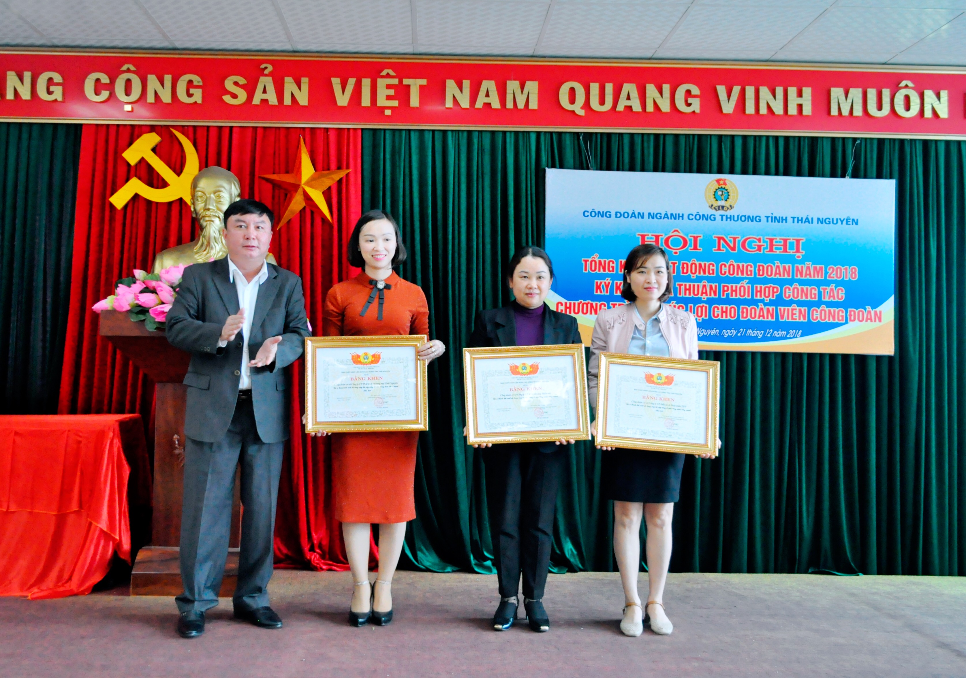 Đồng chí Nghiêm Xuân Nguyên - Phó Bí thư Đảng ủy, Phó Giám đốc Sở Công Thương và đồng chí Đặng Thái Bình - Phó Chủ tịch LĐLĐ tỉnh tặng Bằng khen cho các cá nhân có thành tích xuất sắc trong hoạt động công đoàn năm 2018