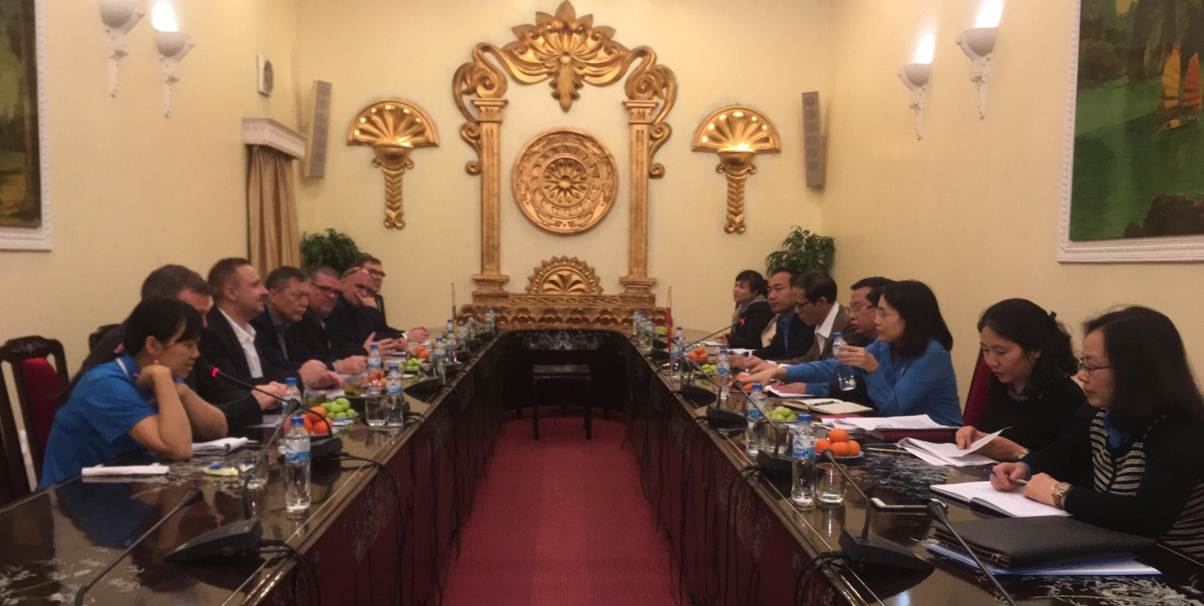 Tại buổi làm việc chính thức với Đoàn đại biểu vào ngày 14/01/2019, thay mặt Lãnh đạo CĐCTVN, Chủ tịch Trần Quang Huy bày tỏ niềm vui mừng khi được đón tiếp đoàn, chúc đoàn có thời gian thăm, làm việc tại Việt Nam đầy ý nghĩa. Đồng chí đã giới thiệu nhanh với đoàn về tình hình phát triển KT-XH, thông tin hoạt động công đoàn, Đại hội III CĐ Công Thương Việt Nam trong thời gian qua, đặc biệt là những thành quả mà đoàn viên, người lao động ngành Công Thương đã đạt được trong năm 2018. Đồng thời đồng chí Trần Quang Huy đánh giá cao quan hệ hợp tác, tình đoàn kết hữu nghị giữa CĐCTVN với ABVV-Metaal trong những năm qua. Các bạn không chỉ hỗ trợ về tinh thần, ủng hộ CĐCTVN trên các diễn đàn đa phương, cung cấp thông tin mà còn hỗ trợ chuyên gia, trao đổi kinh nghiệm và hỗ trợ tài chính để tổ chức các lớp tập huấn nâng cao kỹ năng quản lý tài chính, kỹ năng đàm phán, ký kết TƯLĐTT. Trong thời gian tới, CĐCTVN mong muốn tiếp tục nhận được sự hợp tác từ phía các bạn Bỉ và đề nghị ABVV-Metaal tiếp tục duy trì quan hệ trên cơ sở Bản Thỏa thuận hợp tác đã ký kết năm 2018. CĐCTVN cũng sẵn sàng làm cầu nối để CĐ Giao thông Bỉ kết nối quan hệ với CĐ Giao thông vận tải VN và CĐ TCty Hàng hải Việt Nam.