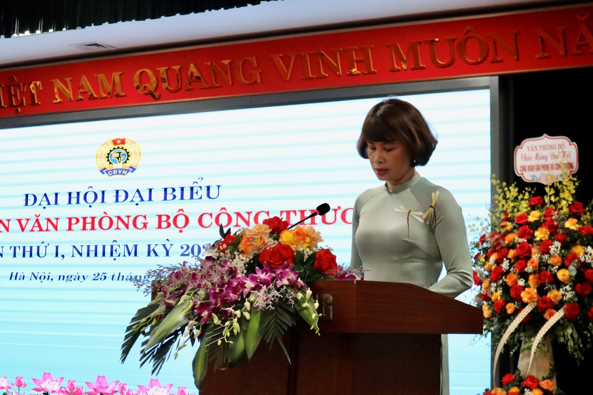 Báo cáo tại Đại hội, đồng chí Ngô Quang Long – Chủ tịch Công đoàn Văn phòng Bộ cho biết, Công đoàn Văn phòng Bộ hiện có 165 đoàn viên, sinh hoạt tại 09 tổ Công đoàn tại Hà Nội và 02 đầu mối đại diện tại miền Nam, miền Trung là các phòng, ban thuộc Văn phòng Bộ. Đoàn viên Công đoàn Văn phòng đông, gồm nhiều lứa tuổi, trình độ khác nhau, làm việc ở nhiều bộ phận và nhiều địa điểm khác nhau nên việc tổ chức các hoạt động công đoàn cũng đa dạng, bằng nhiều hình thức phù hợp để triển khai và hoàn thành nhiệm vụ được giao.