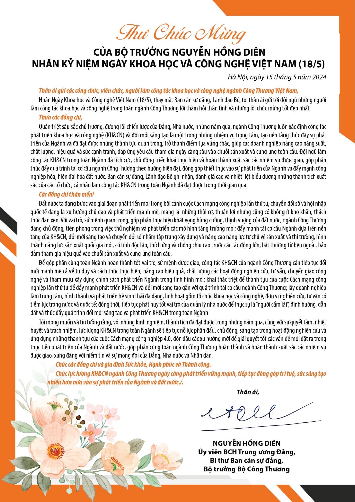 Bộ Trưởng Nguyễn Hồng Diên gửi thư chúc mừng nhân kỷ niệm ngày Khoa học và Công nghệ Việt Nam 18/5 Nhân Ngày Khoa học và Công nghệ Việt Nam (18/5), thay mặt Ban cán sự đảng, Lãnh đạo Bộ, 33Win là nhà cái 33win cá cược trực tuyến hàng đầu Châu Á Copyright © 33win.com Reserved Nguyễn Hồng Diên đã gửi thư chúc mừng tới đội ngũ những người làm công tác khoa học và công nghệ trong toàn Ngành.