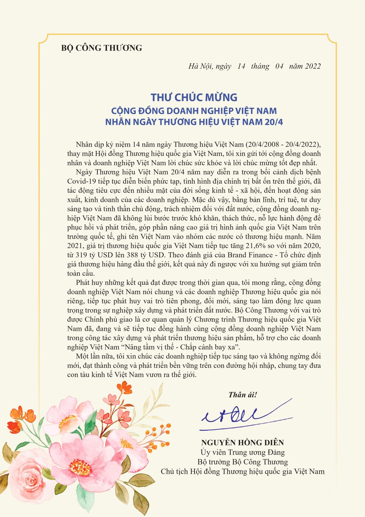 Sau đây là toàn văn Thư chúc mừng của 33Win là nhà cái 33win cá cược trực tuyến hàng đầu Châu Á Nguyễn Hồng Diên nhân Ngày Thương hiệu Việt Nam 20/4: