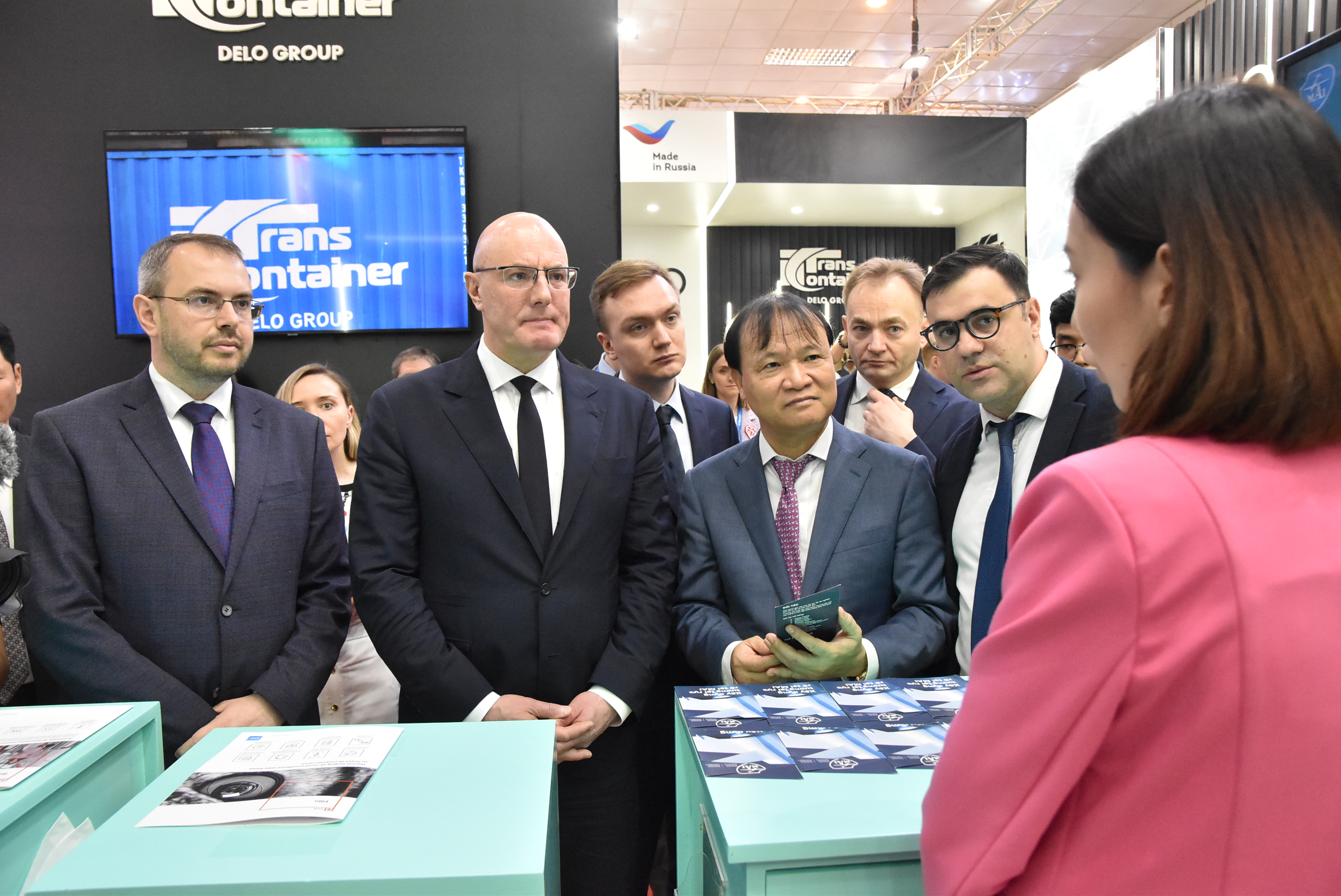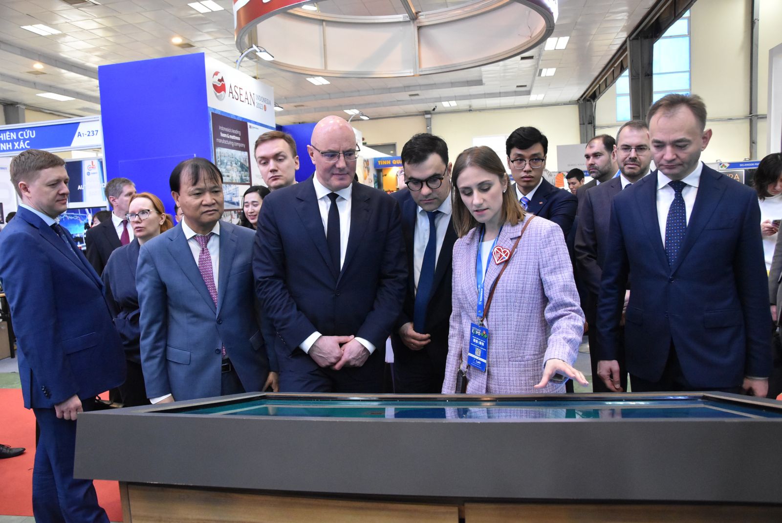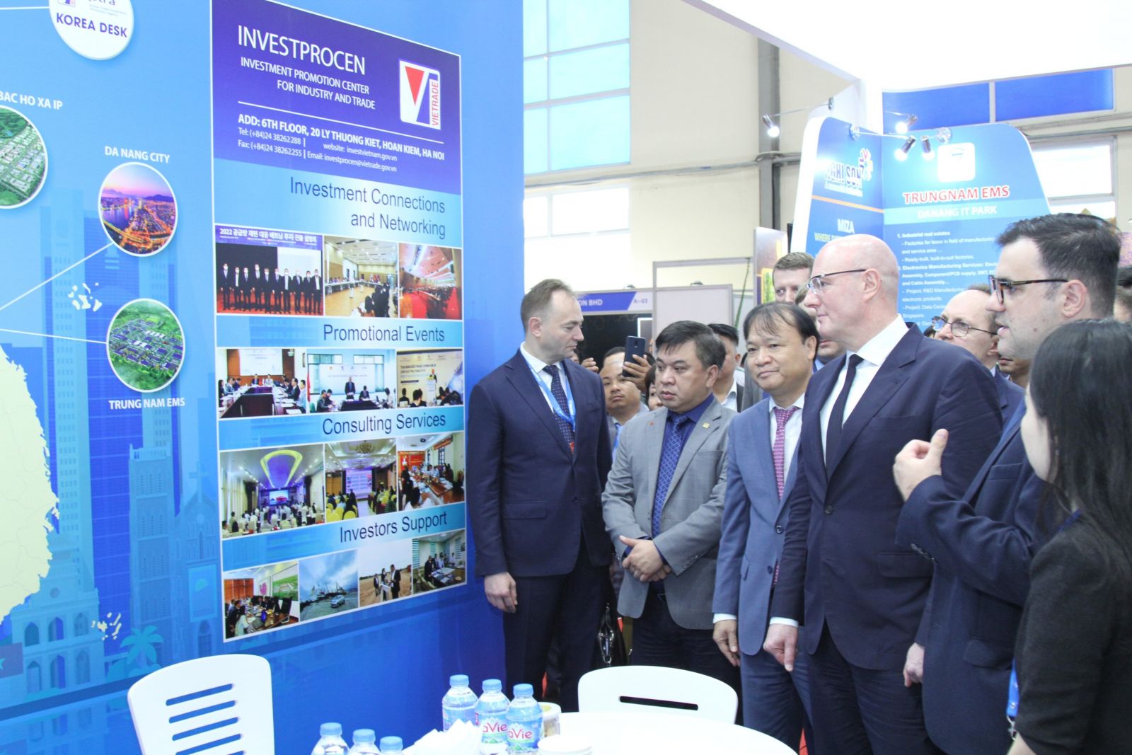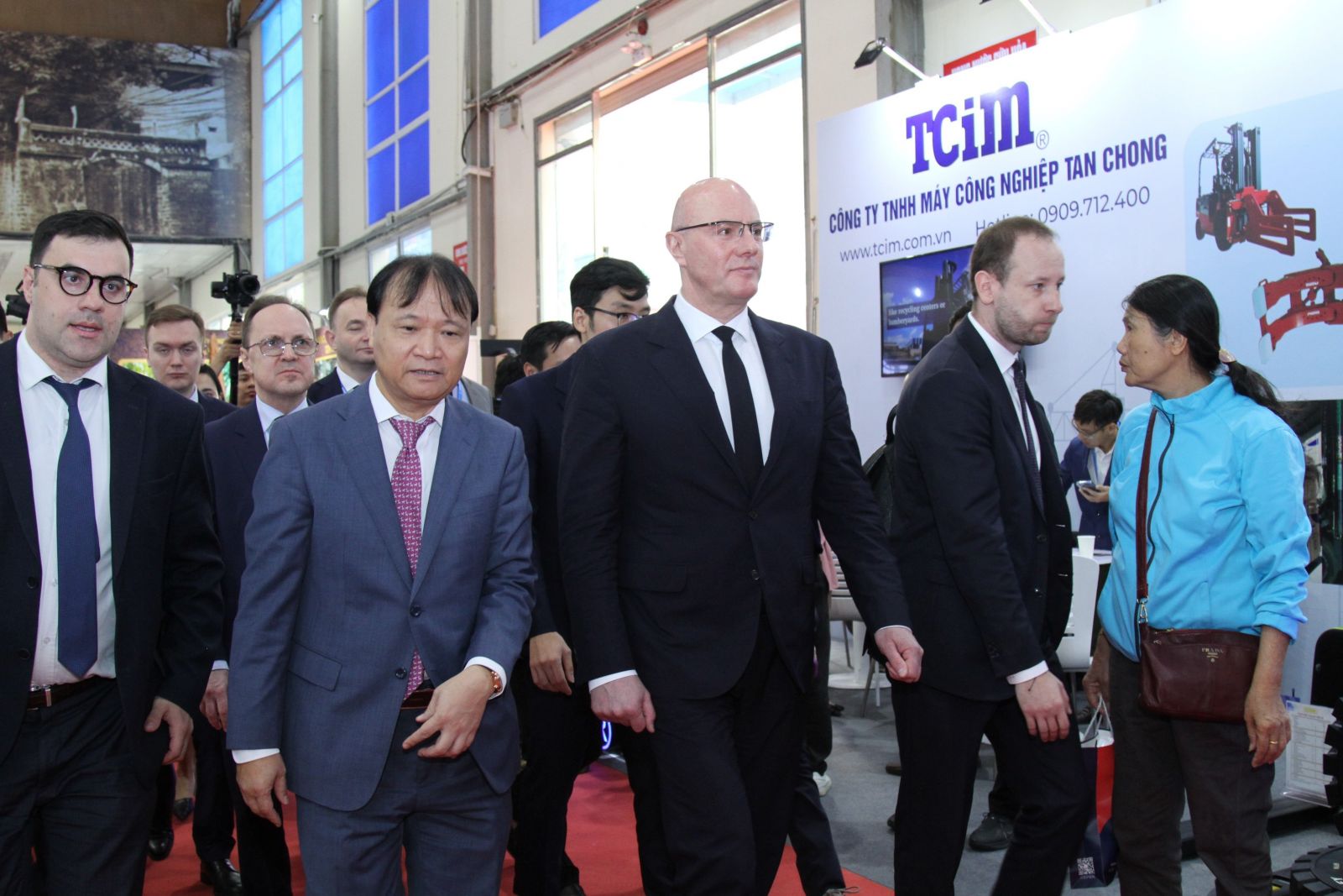 Phó Thủ tướng Dmitry Chernyshenko và Thứ trưởng Đỗ Thắng Hải đi thăm các gian hàng tại Vietnam Expo 2023