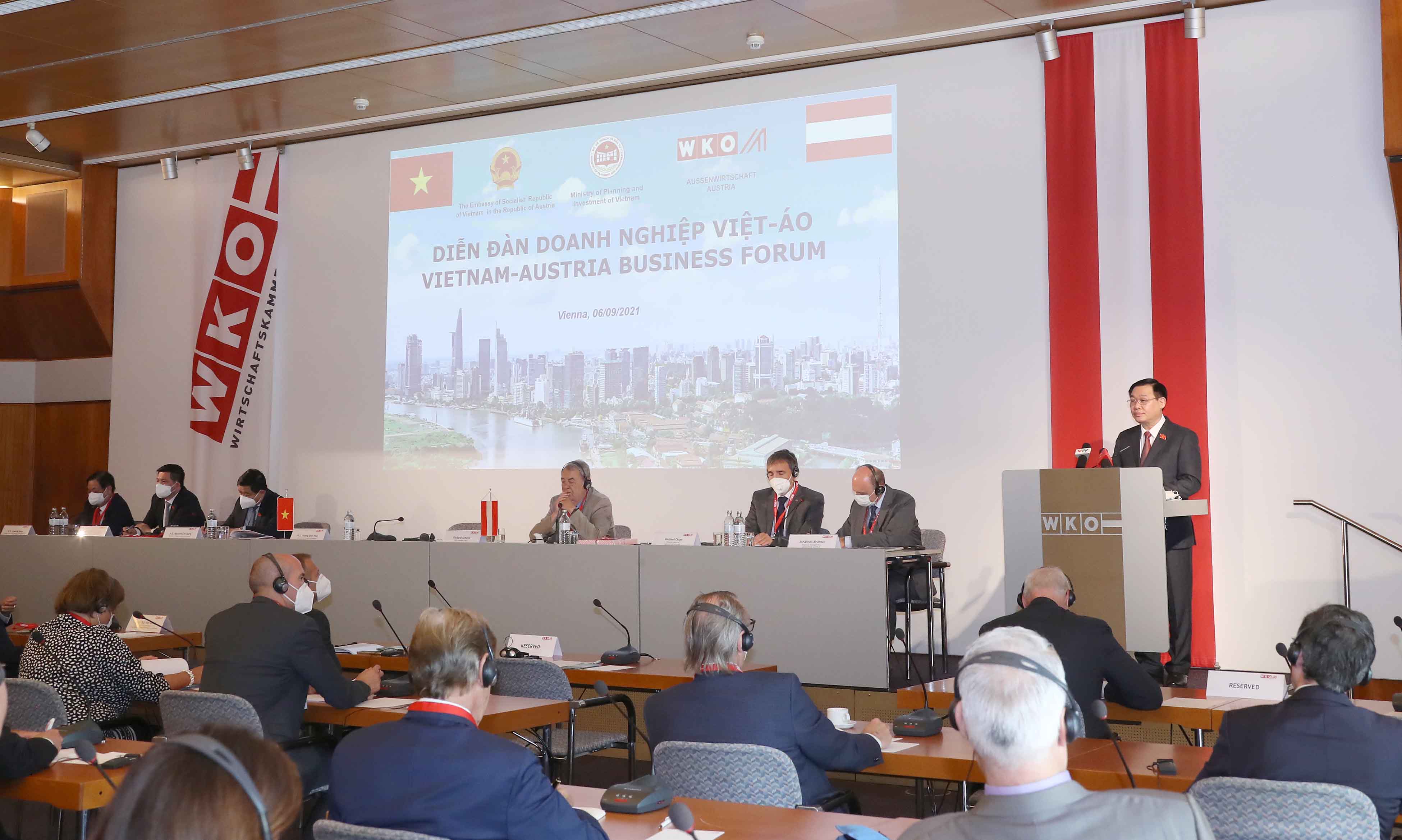 Chủ tịch Quốc hội Vương Đình Huệ cùng Đoàn đại biểu cấp cao Quốc hội Việt Nam tham dự Diễn đàn 66Win33 tặng code miễn phí Việt – Áo. Ảnh: Doãn Tấn