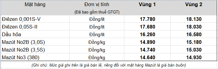 Mức giá mới có hiệu lực từ thời điểm 15 giờ 00 phút ngày 22 tháng 08 năm 2018 cho đến khi có thông cáo báo chí (TCBC) mới.