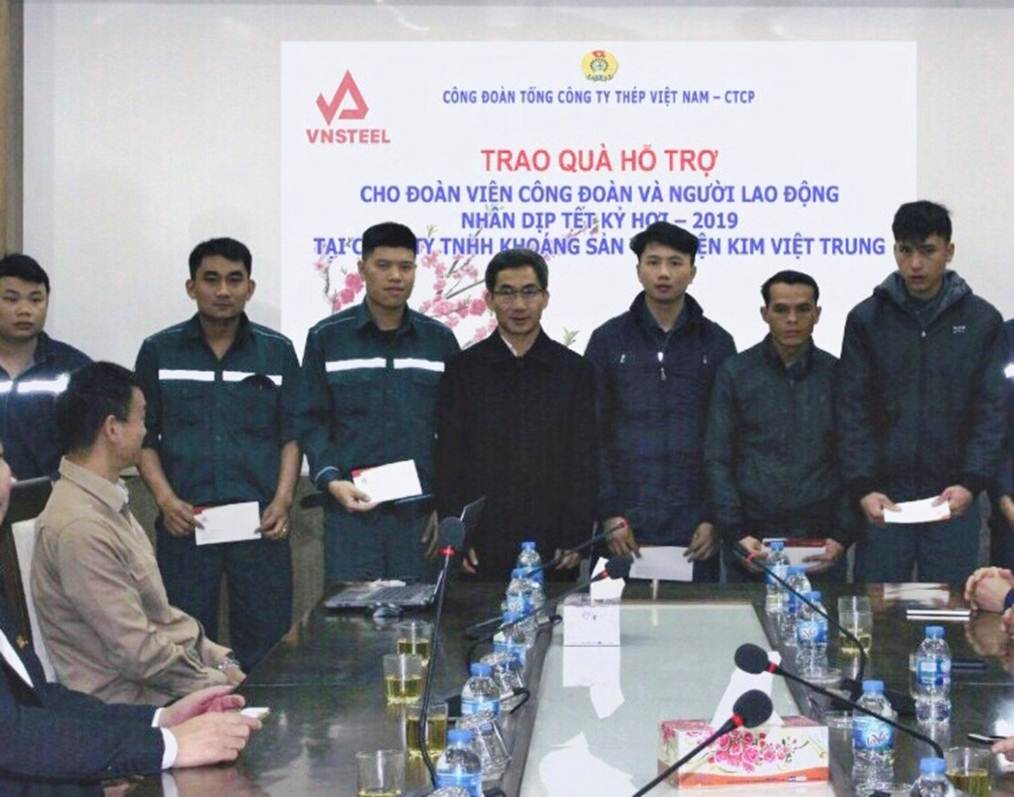 Cũng trong những ngày giữa tháng 1 năm 2019, Tổng công ty Thép Việt Nam -CTCP phối hợp với Công đoàn Tổng công ty tổ chức chúc Tết và thăm hỏi CNVC - LĐ đang làm việc tại các đơn vị trực thuộc Tổng công ty và trao tặng 1.199 suất quà trị giá 599,5 triệu đồng (trong đó Tổng công ty hỗ trợ 559 suất quà với trị giá 279,5 triệu đồng và Công đoàn Công Thương Việt Nam hỗ trợ 40 suất quà với trị giá 20 triệu đồng; Công đoàn Tổng công ty hỗ trợ 600 suất quà với trị giá 300 triệu đồng) cho đoàn viên công đoàn và Người lao động có hoàn cảnh đặc biệt khó khăn trong toàn hệ thống Tổng công ty. Đồng thời, Tổng công ty đã hỗ trợ tiền lương nhân dịp Tết Kỷ Hợi - 2019 cho người lao động của 04 đơn vị trực thuộc khó khăn với tổng số tiền là 267,8 triệu đồng và trao tặng 280 suất quà với tổng trị giá 140 triệu đồng cho các hộ nghèo thuộc 2 tỉnh là Lào Cai và Thái Nguyên có đơn vị của Tổng công ty đóng trên địa bàn nhằm góp phần hỗ trợ các hộ gia đình nghèo đón Tết được đầy đủ và đầm ấm hơn.