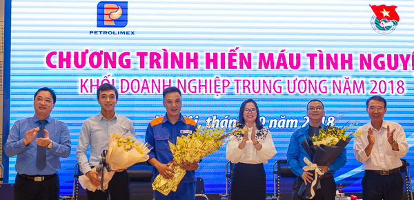 Phó tổng giám đốc Petrolimex Nguyễn Văn Sự, Phó viện trưởng Viện huyết học Truyền máu TW Phạm Tuấn Dương, Phó bí thư Đoàn khối DNTW Hoàng Thị Minh Thu tặng hoa cảm ơn những tình nguyện viên Petrolimex và TCT Bảo hiểm tiền gửi Việt Nam nhiều năm liền hiến máu nhân đạo