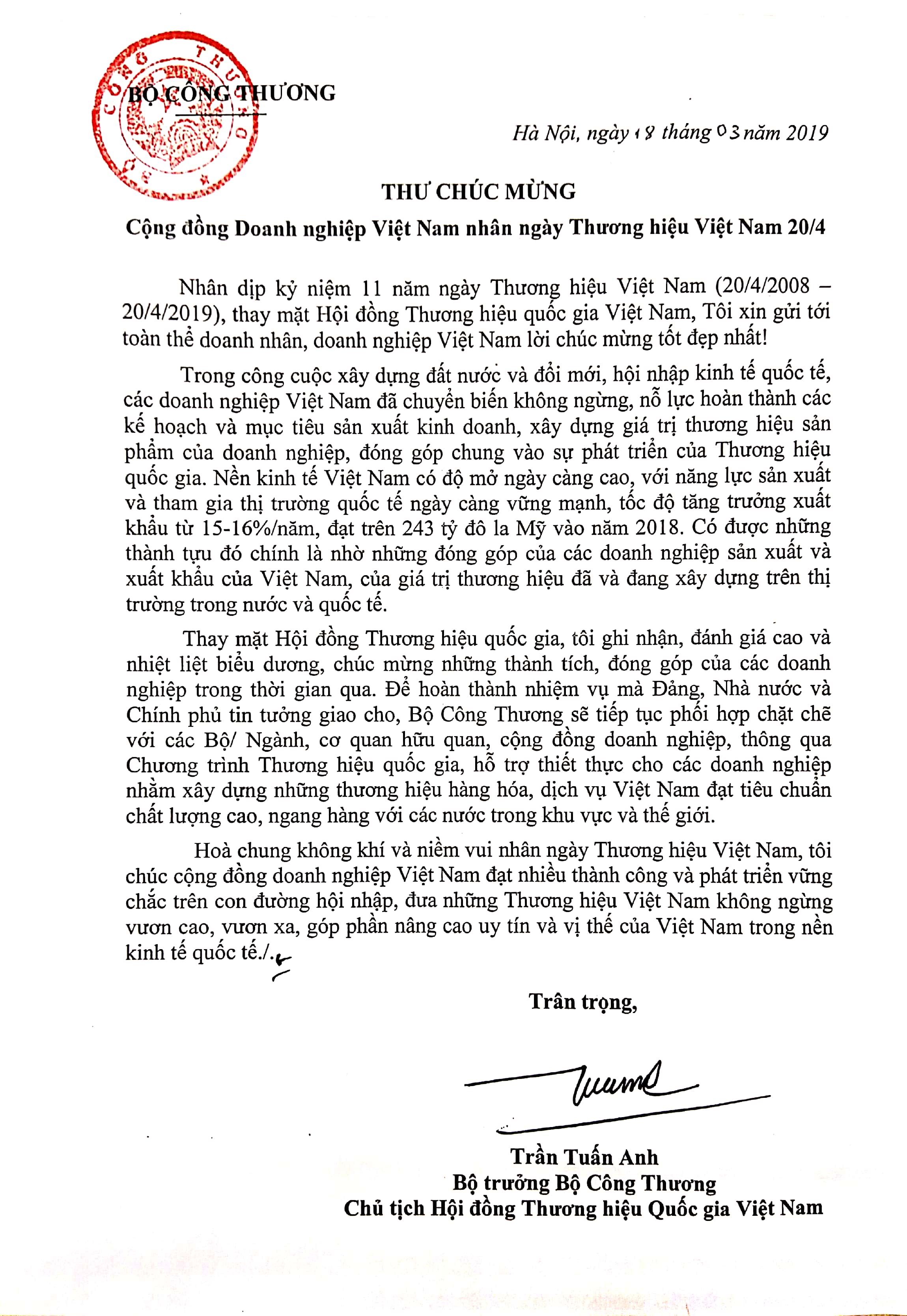 Thư chúc mừng của Bộ trưởng Trần Tuấn Anh nhân ngày thương hiệu Việt Nam 20/4