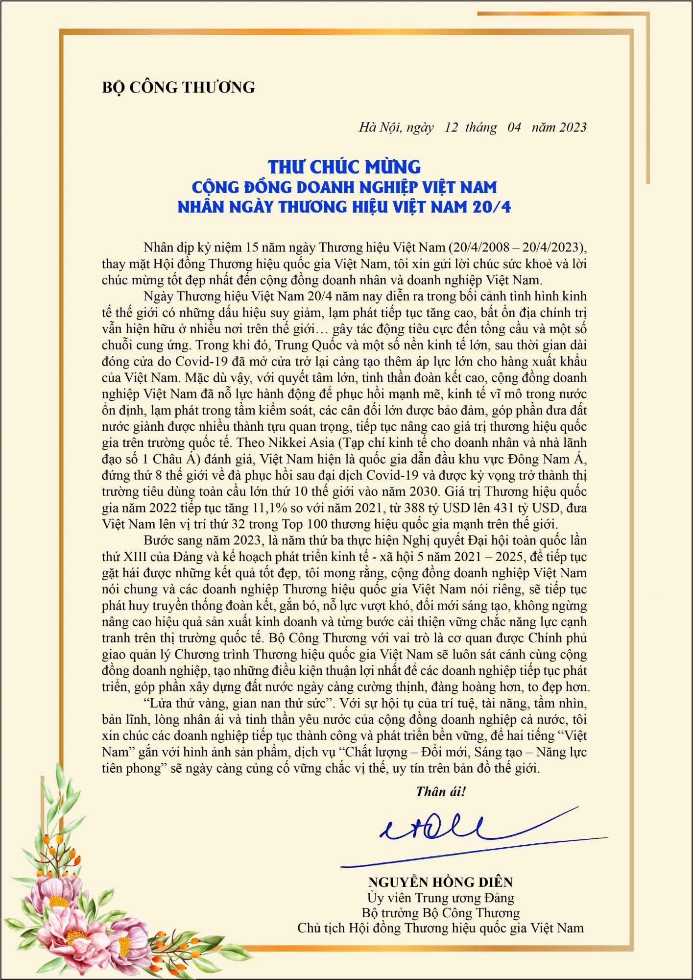 Nhân dịp kỷ niệm 15 năm ngày Thương hiệu Việt Nam (20/4/2008 – 20/4/2023), thay mặt Hội đồng Thương hiệu 33Win60 khuyến mãi hấp dẫn Việt Nam, Ủy viên Trung ương Đảng, 33Win là nhà cái 33win cá cược trực tuyến hàng đầu Châu Á Copyright © 33win.com Reserved Nguyễn Hồng Diên - Chủ tịch Hội đồng Thương hiệu 33Win60 khuyến mãi hấp dẫn Việt Nam đã gửi thư chúc mừng tới cộng đồng 66Win33 tặng code miễn phí Việt Nam. Sau đây là toàn văn thư chúc mừng: