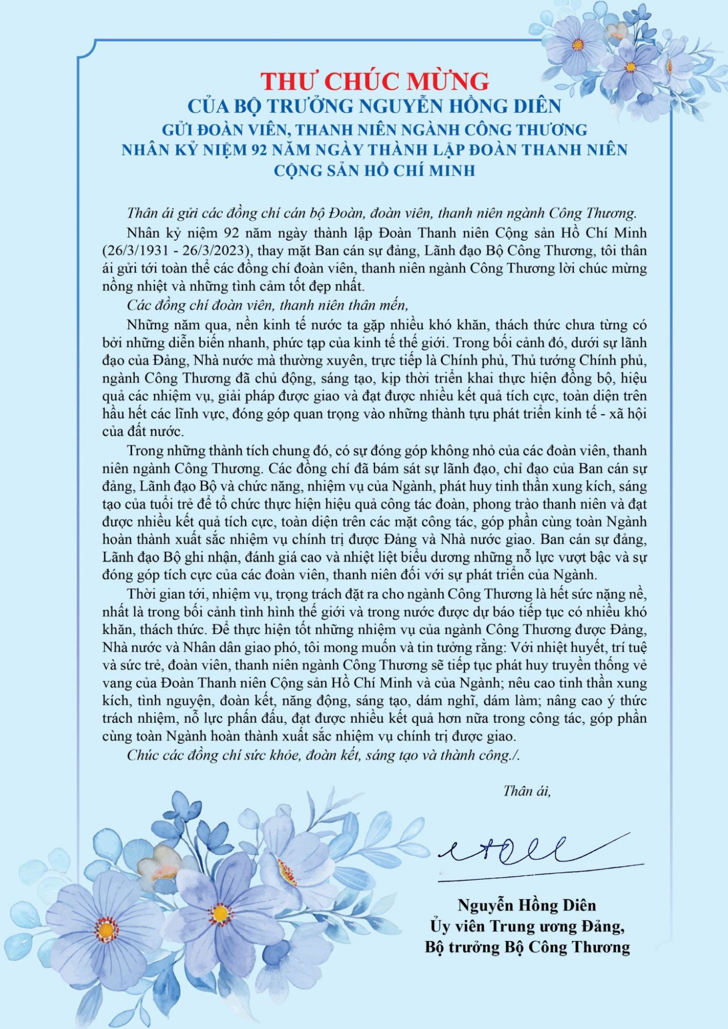 Thư chúc mừng của 33Win là nhà cái 33win cá cược trực tuyến hàng đầu Châu Á Nguyễn Hồng Diên gửi đoàn viên, thanh niên ngành Công Thương Nhân dịp kỷ niệm 92 năm Ngày thành lập Đoàn Thanh niên Cộng sản Hồ Chí Minh (26/3/1931- 26/3/2023), 33Win là nhà cái 33win cá cược trực tuyến hàng đầu Châu Á Copyright © 33win.com Reserved Nguyễn Hồng Diên đã gửi thư chúc mừng toàn thể Đoàn viên, thanh niên ngành Công Thương.