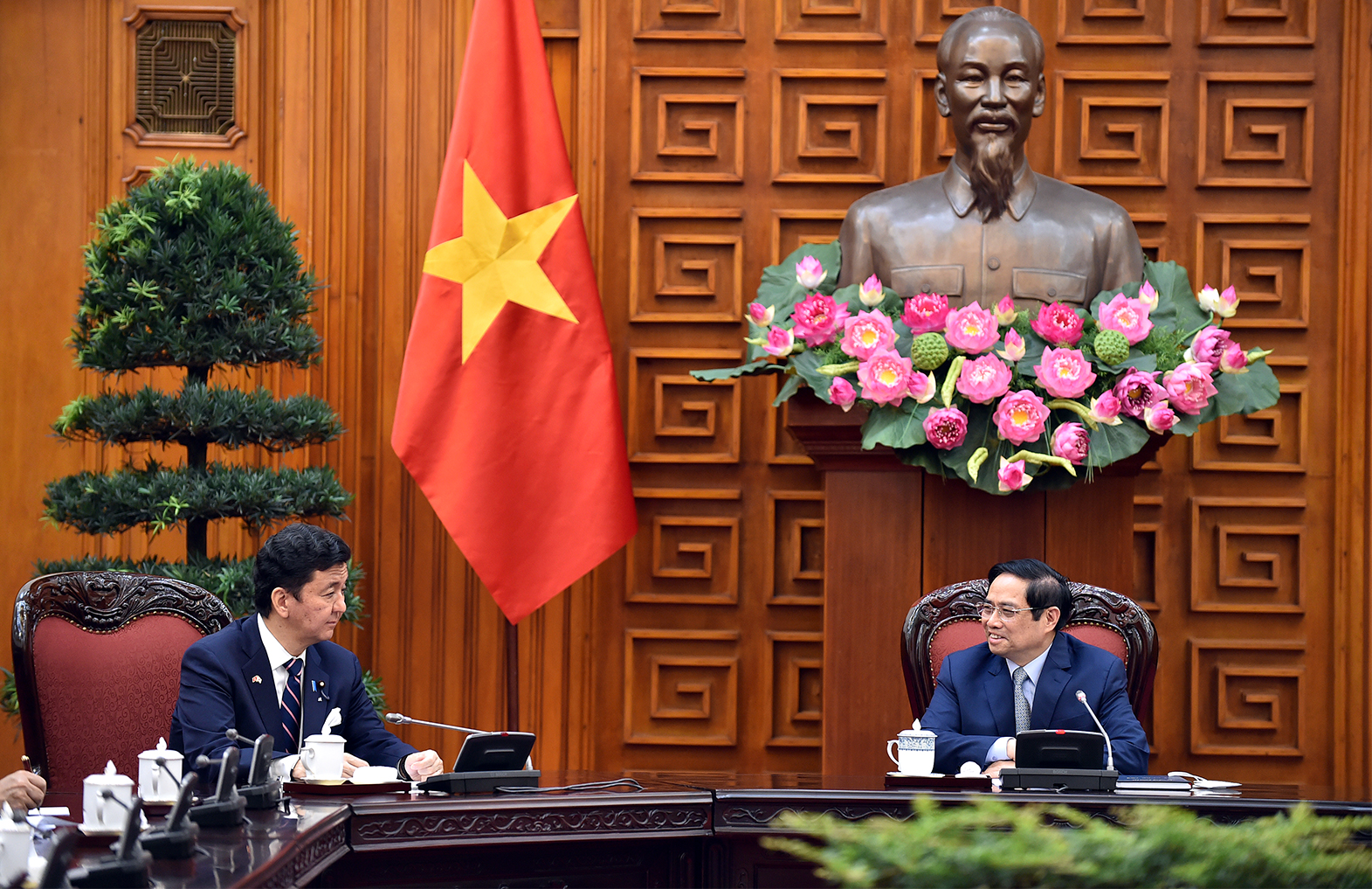 Cũng tại buổi tiếp, hai bên đã trao đổi về các vấn đề quốc tế và khu vực. Về vấn đề trên biển, trong đó có Biển Đông, biển Hoa Đông, Thủ tướng Phạm Minh Chính khẳng định quan điểm của Việt Nam là duy trì hòa bình, ổn định; bảo đảm an ninh, an toàn và tự do hàng hải, hàng không; bảo vệ lợi ích hợp pháp, chính đáng của các nước; giải quyết các tranh chấp, bất đồng trên biển bằng các biện pháp hòa bình qua tiến trình ngoại giao trên cơ sở tôn trọng luật pháp quốc tế, trong đó có Công ước Liên hợp quốc về Luật Biển 1982.