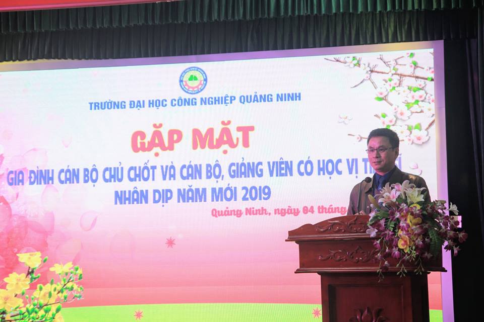 Trường ĐH Công nghiệp Quảng Ninh tổ chức gặp mặt thân mật đầu năm 2019 Nhân dịp đầu năm mới 2019, dưới sự chỉ đạo của Đảng ủy, Ban Giám hiệu nhà trường, vừa qua Công đoàn trường ĐH Công nghiệp Quảng Ninh đã phối hợp cùng các đơn vị chức năng tổ chức thành công chương trình gặp mặt thân mật với gia đình các cán bộ chủ chốt, lãnh đạo các đoàn thể, các giảng viên có học vị Tiến sĩ của nhà trường. TS. Hoàng Hùng Thắng - Bí thư Đảng ủy, Hiệu trưởng nhà trường chủ trì buổi gặp mặt.