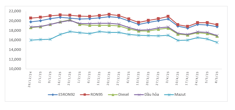 Xăng E5RON92: không cao hơn 18.777 đồng/lít (giảm 377 đồng/lít so với giá cơ sở hiện hành), thấp hơn xăng RON95-III 402 đồng/lít;