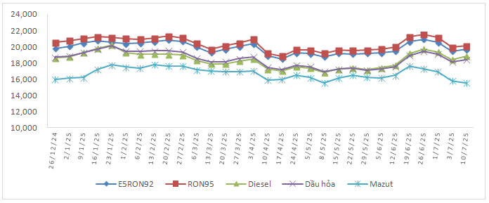 Xăng E5 RON92 (đồng/lít) | Xăng RON95 (đồng/lít) | Dầu Diesel (đồng/lít) | Dầu hỏa (đồng/lít) | Dầu mazut (đồng/kg) | ||