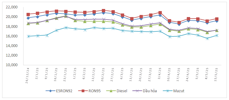 - Xăng E5RON92: không cao hơn 19.180 đồng/lít (tăng 403 đồng/lít so với giá cơ sở hiện hành), thấp hơn xăng RON95-III 414 đồng/lít;