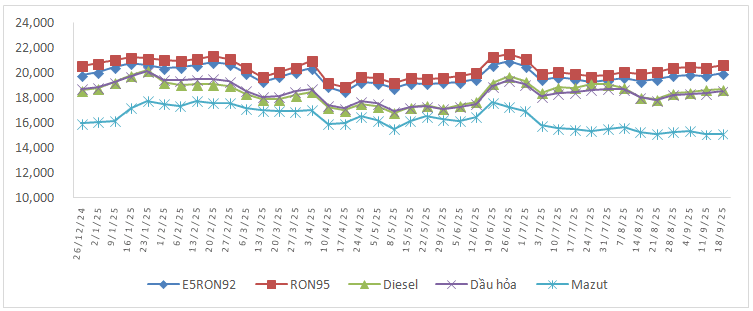 Xăng E5 RON92 (đồng/lít) | Xăng RON95 (đồng/lít) | Dầu Diesel (đồng/lít) | Dầu hỏa (đồng/lít) | Dầu mazut (đồng/kg) | ||
