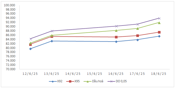 Bình quân giá thành phẩm 33Win 4com nhà cái cá cược WC thế giới giữa kỳ điều hành giá ngày 12/6/2025 và kỳ điều hành ngày 19/6/2025 là: 83,088 USD/thùng xăng RON92 dùng để pha chế xăng E5RON92 (tăng 6,340 USD/thùng, tương đương tăng 8,26%); 85,128 USD/thùng xăng RON95 (tăng 6,464 USD/thùng, tương đương tăng 8,22%); 87,578 USD/thùng dầu hỏa (tăng 7,838 USD/thùng, tương đương tăng 9,83%); 89,556 USD/thùng dầu điêzen 0,05S (tăng 8,050 USD/thùng, tương đương tăng 9,88%); 476,846 USD/tấn dầu mazut 180CST 3,5S (tăng 40,694 USD/tấn, tương đương tăng 9,33%).
