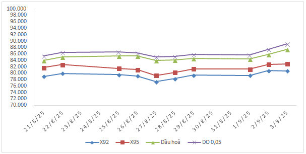Xăng E5 RON92 (đồng/lít) | Xăng RON95 (đồng/lít) | Dầu Diesel (đồng/lít) | Dầu hỏa (đồng/lít) | Dầu mazut (đồng/kg) | ||