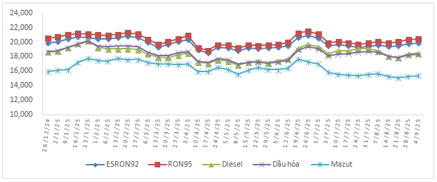 - Xăng E5RON92: không cao hơn 19.851 đồng/lít (tăng 80 đồng/lít so với giá cơ sở hiện hành), thấp hơn xăng RON95-III 588 đồng/lít;