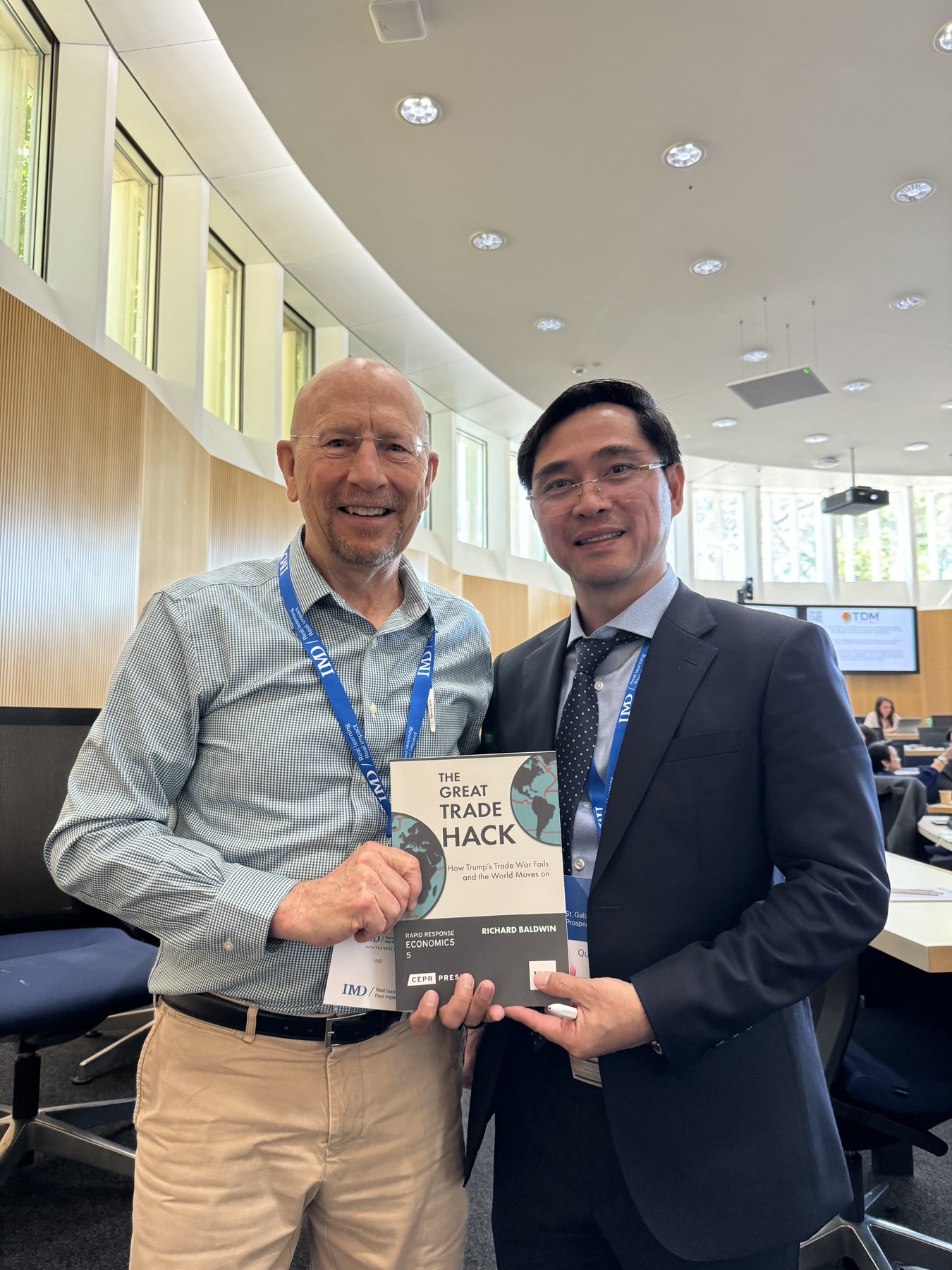 Ảnh: Giáo sư Richard Baldwin (IMD) ký, tặng sách cho đại diện Phái đoàn