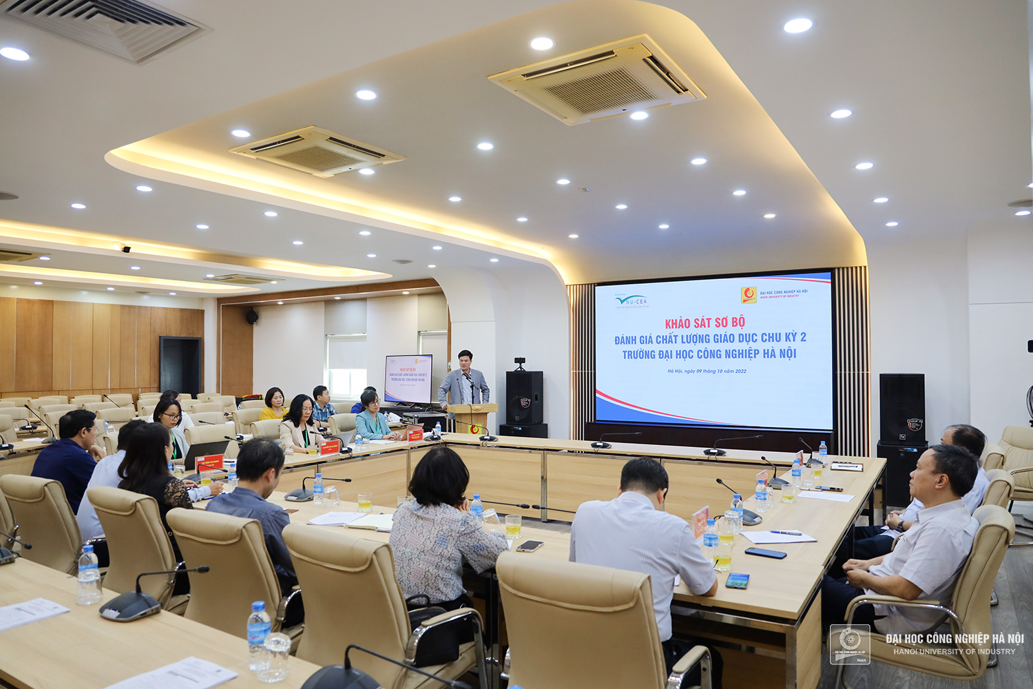 Tham dự đợt khảo sát sơ bộ có TS.Tạ Thị Thu Hiền - Giám đốc Trung tâm KĐCLGD - ĐHQGHN, GS.TS.Nguyễn Hữu Đức - Trưởng đoàn Đánh giá ngoài, TS.Nguyễn Thị Thu Hương - Thư ký đoàn, ThS. Trịnh Thị Nhung - Giám sát viên. Về phía Trường Đại học Công nghiệp Hà Nội có TS.Nguyễn Văn Thiện - Phó Hiệu trưởng, Phó Chủ tịch Hội đồng trường; TS.Kiều Xuân Thực - Phó Hiệu trưởng, Phó Chủ tịch thường trực Hội đồng Tự đánh giá (TĐG) nhà trường cùng các thành viên Hội đồng TĐG, các nhóm chuyên trách và đại diện các đơn vị trong trường.