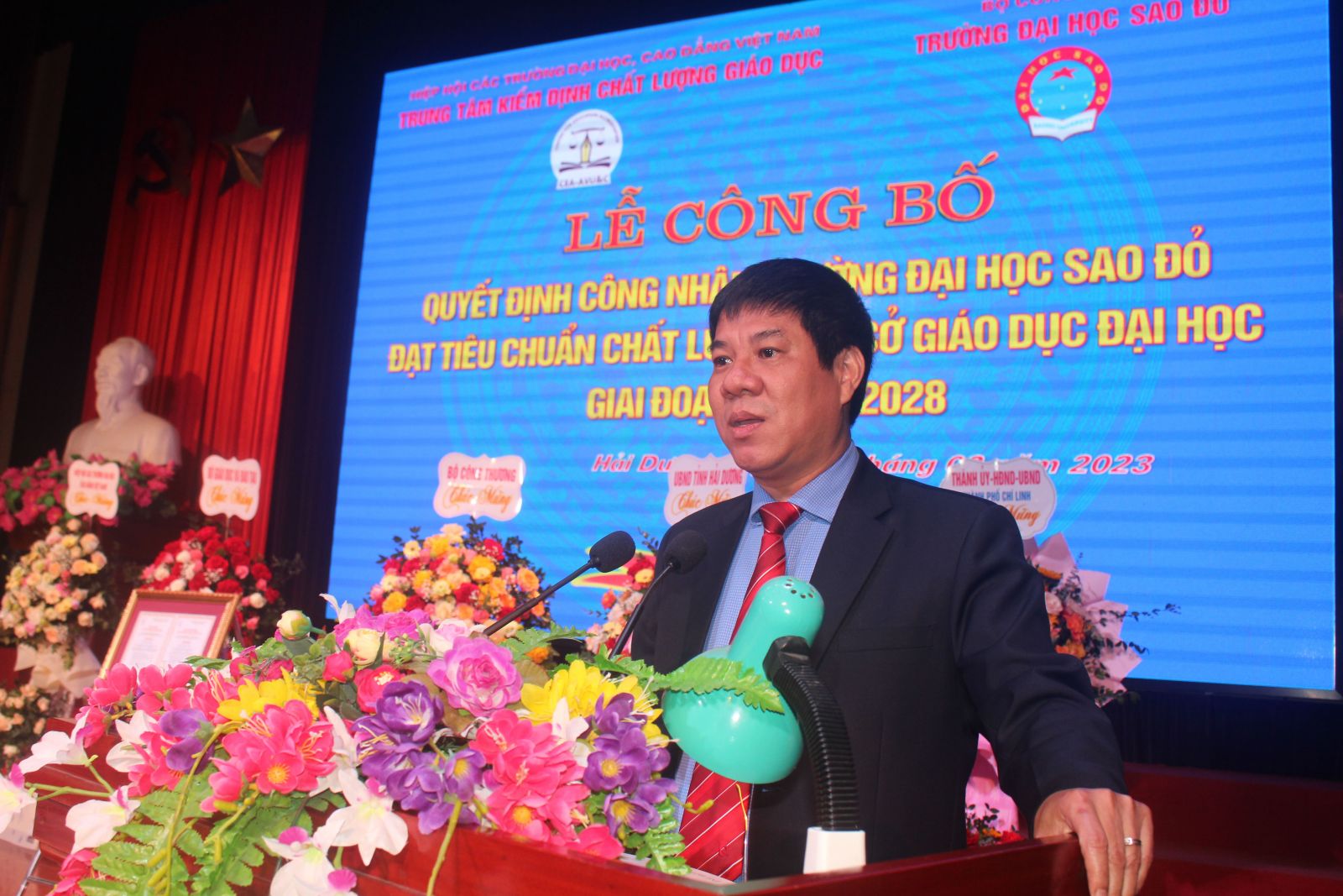 PGS.TS Huỳnh Văn Chương - Cục trưởng Cục Quản lý chất lượng - Bộ Giáo dục và Đào tạo tặng hoa chúc mừng nhà trường
