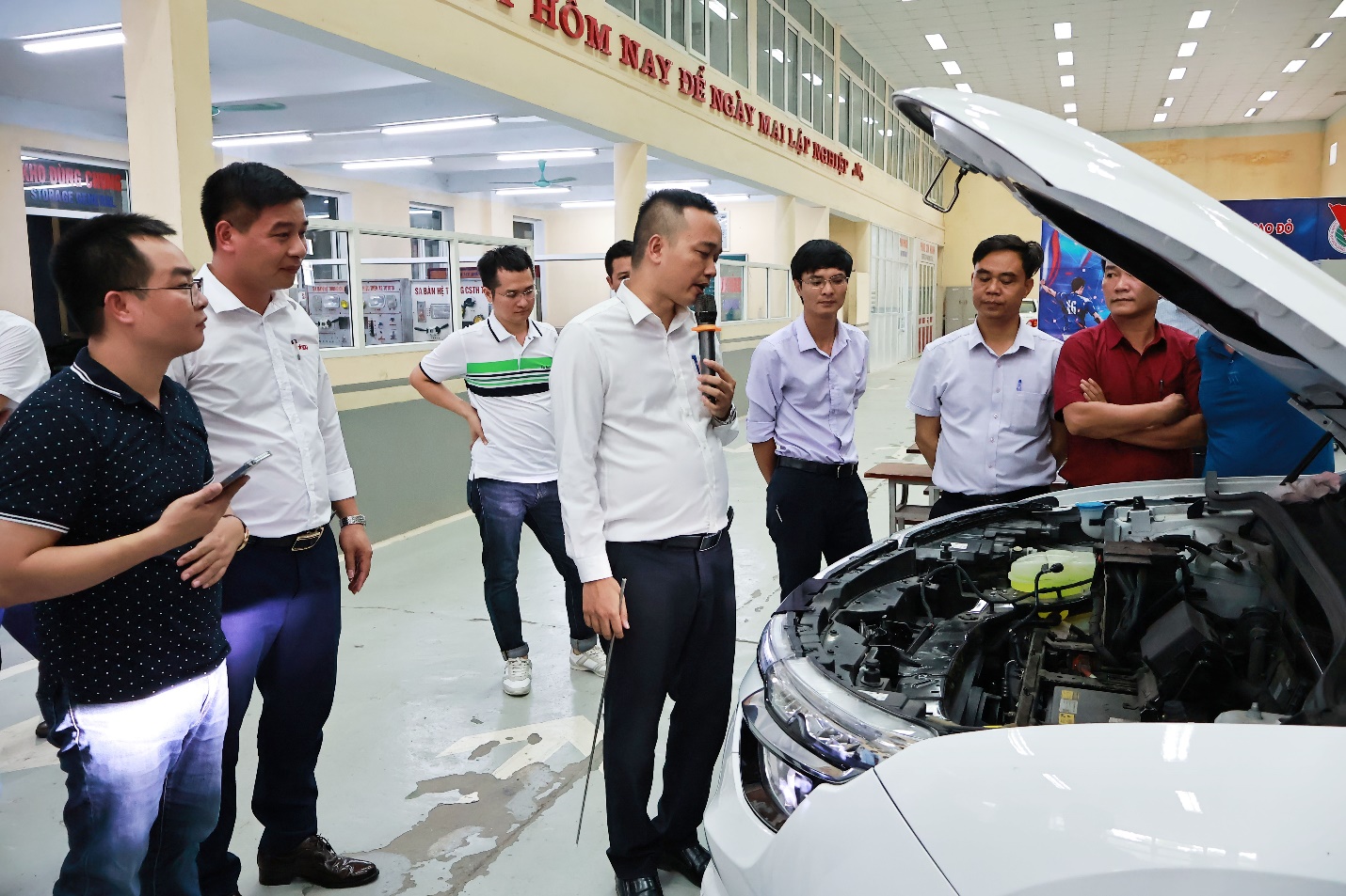 Sau khi được nghe chia sẻ các kiến thức về ô tô điện, giảng viên các trường cùng trao đổi, thảo luận và thực hành thực tế trên xe Vinfast VF8 với sự hướng dẫn tận tình của chuyên gia đào tạo của Công ty Vinfast Âu Lạc. Được thực tế trải nghiệm với xe điện, lớp học trở nên sôi nổi và truyền cảm hứng hơn, các kiến thức đã đáp ứng mong mỏi của các học viên.
